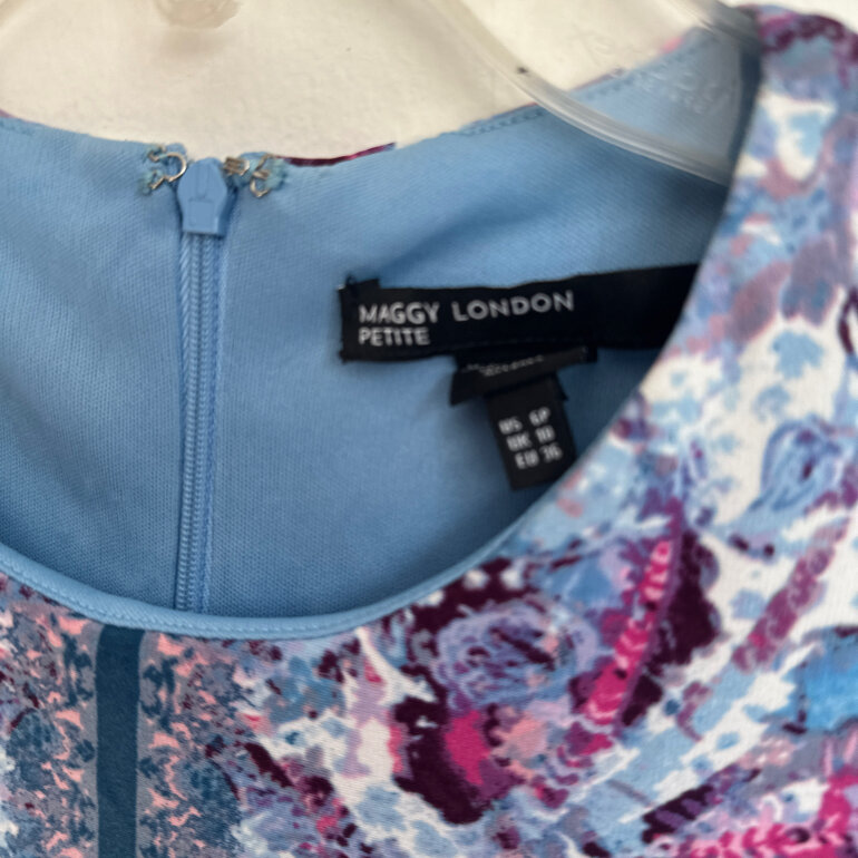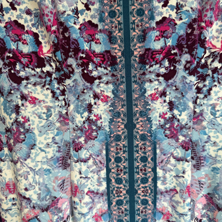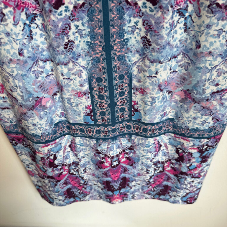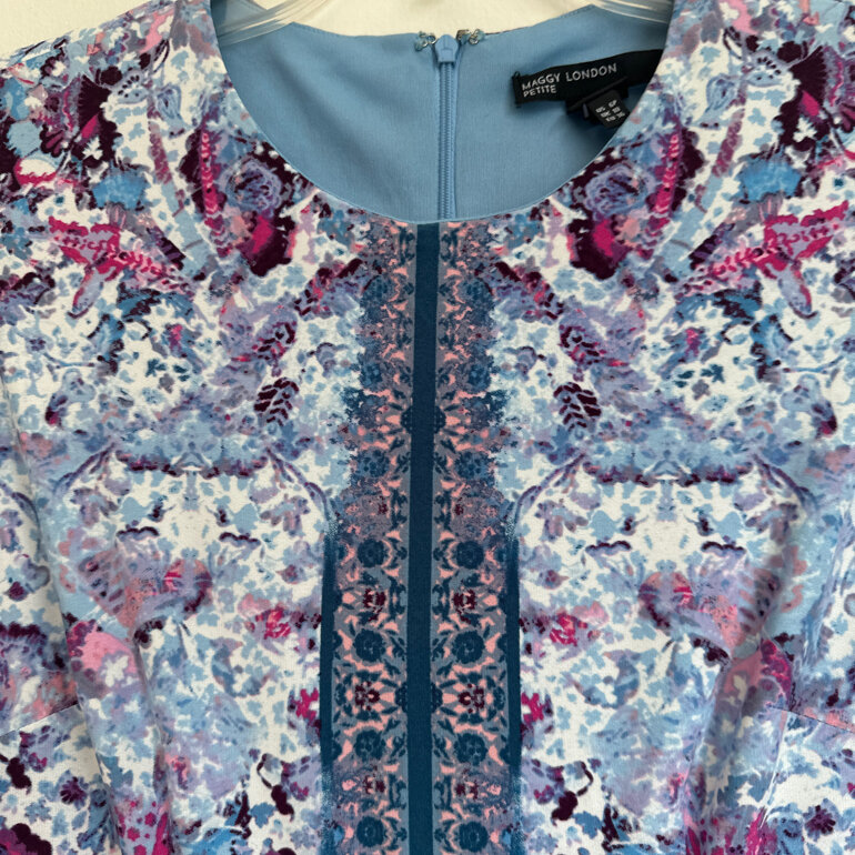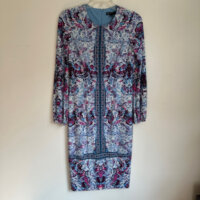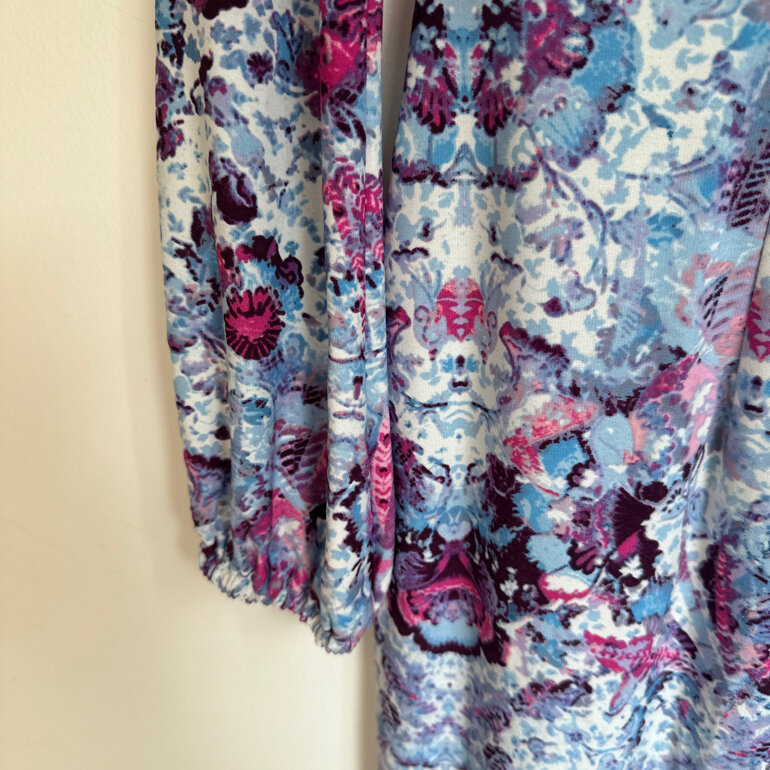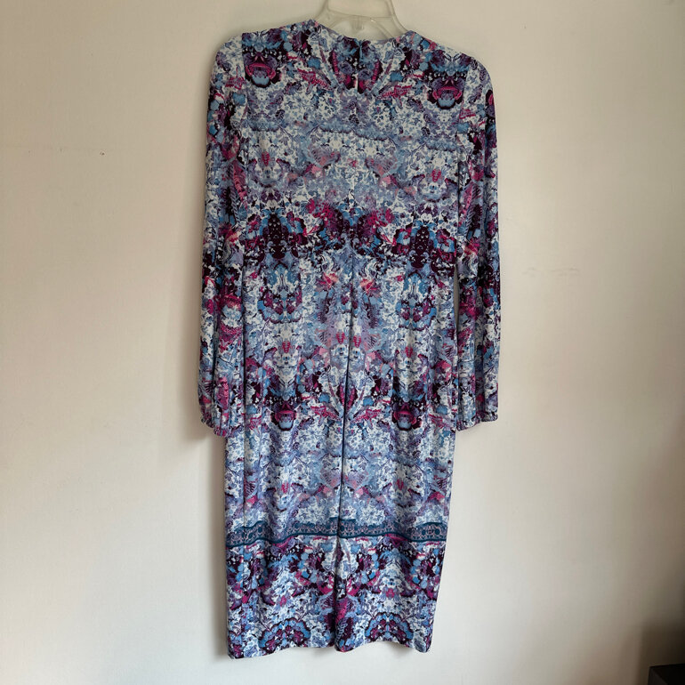 Hermoso y elegante vestido com estampado en varios tonos de azul, rosa y vino. Cuello redondo, cierre oculto por la espalda, manga larga con resorte en el puño.