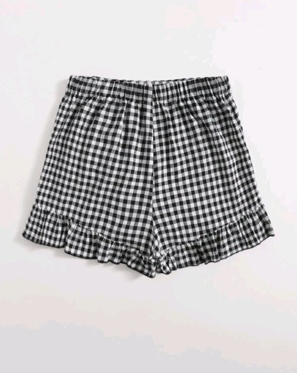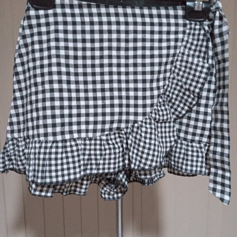 Falda short skort color blanco con negro a cuadros, resorte trasero, de olan, cinta lateral para ajustar, de cintura, short interior, tela poliester algodón, marca Shein, talla XS