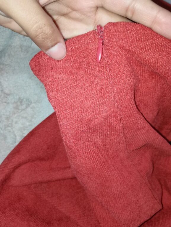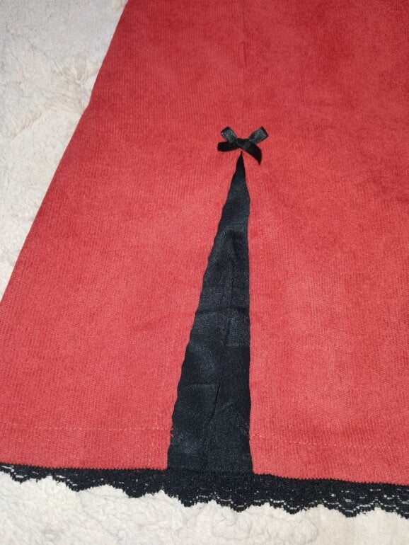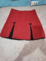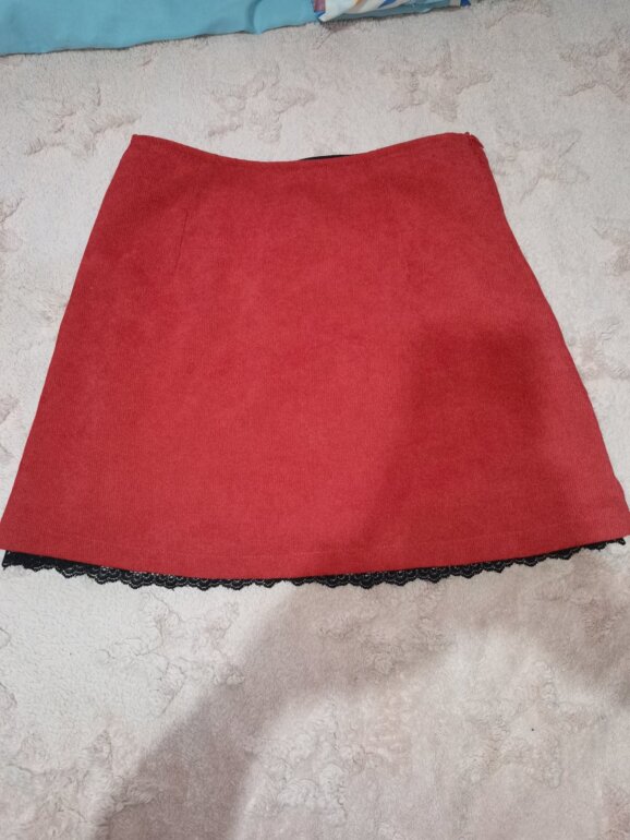 Falda de pana con fondo negro y encaje al final, pegada, con detalle de 2 moñitos negros. Talla XS, tiene un cierre al costado derecho. Es color ladrillo quemado, pegada al cuerpo.