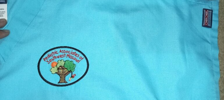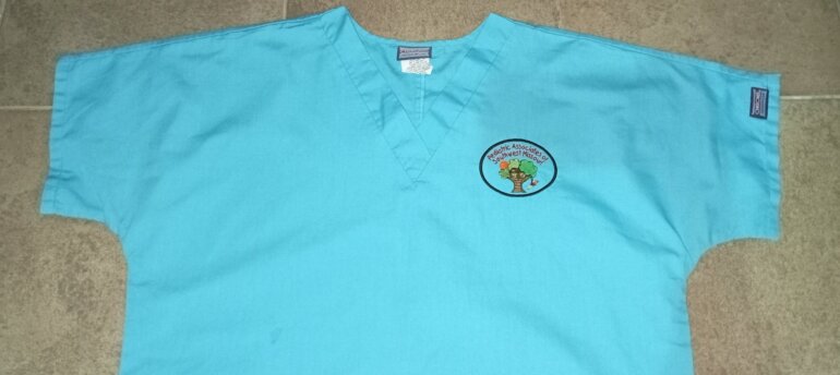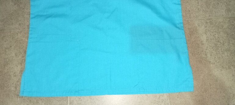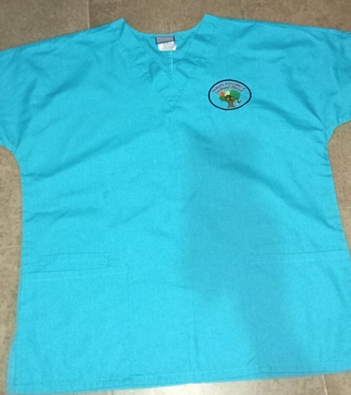 Filipina unisex color azul con logo bordado de pediatría 8.5x6.5, tela de algodón y poliéster , talla M, cuello en V, medidas, pecho 59cm, cintura 56cm, parte baja 57cm, largo 70cm