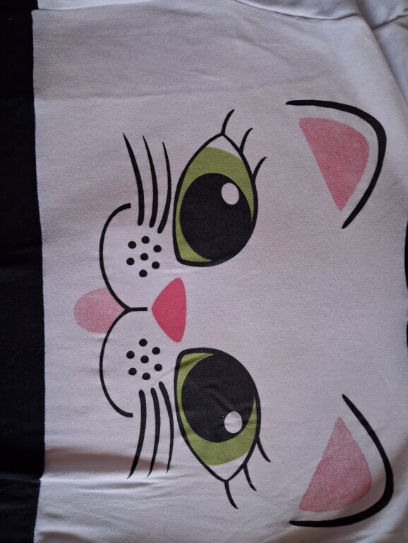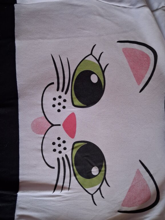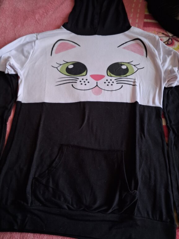 Esta prenda tiene un gatito en el pecho de ojos verdes, las mangas son negras,tiene un gorro negro, la talla es chica y tiene bolsas al frente.