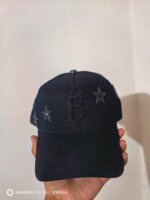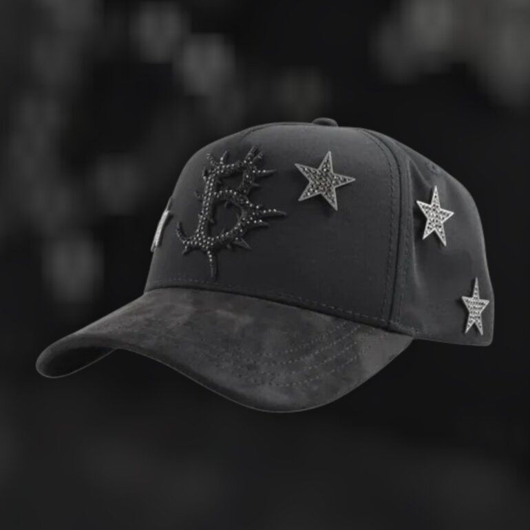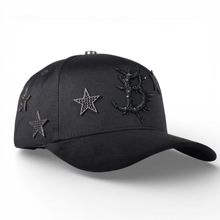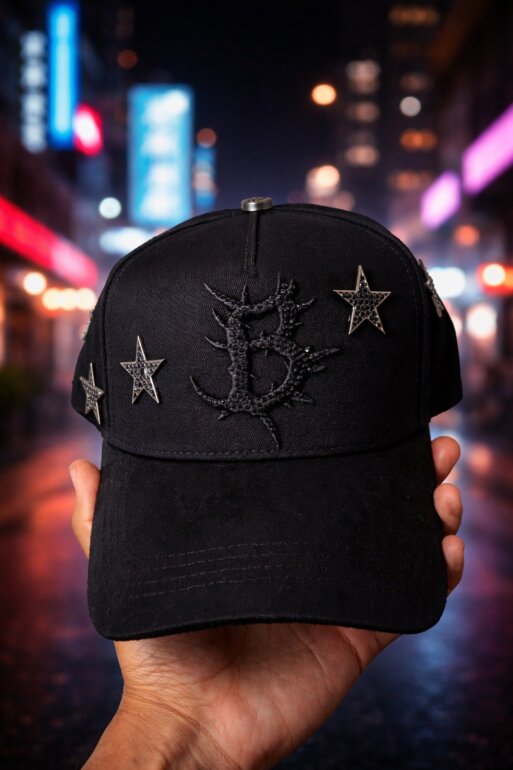 Gorra Dark Nebula. Base negra con bordado central en relieve y detalles de estrellas con aplicaciones brillantes. Es cómoda, versátil y fácil de combinar con outfits casuales, streetwear o cualquiera de tus outfits.