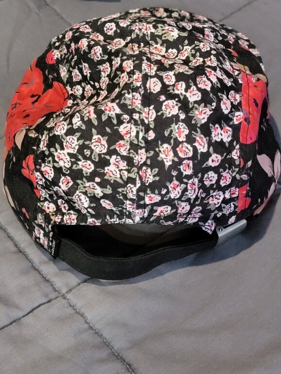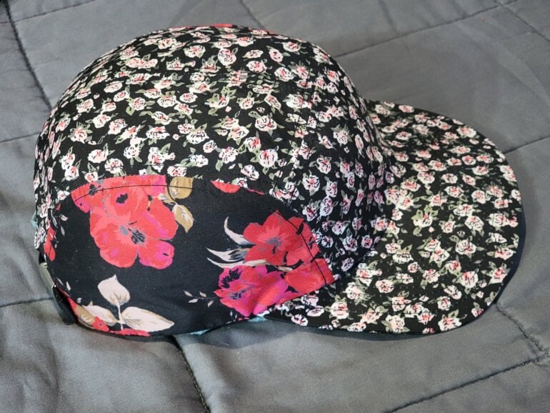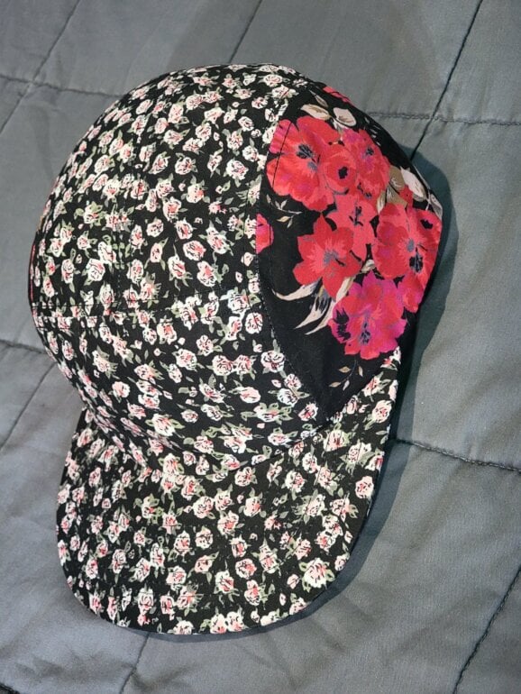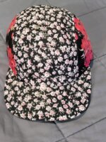 Gorra con estampado floreado, en fondo negro.