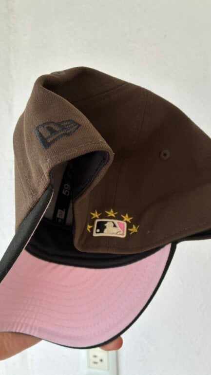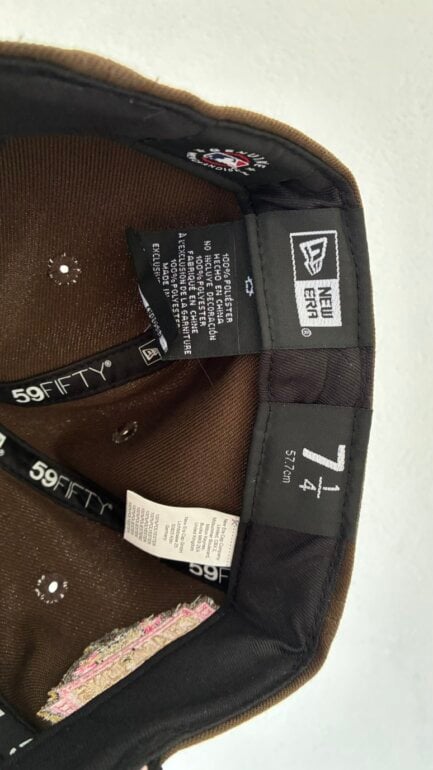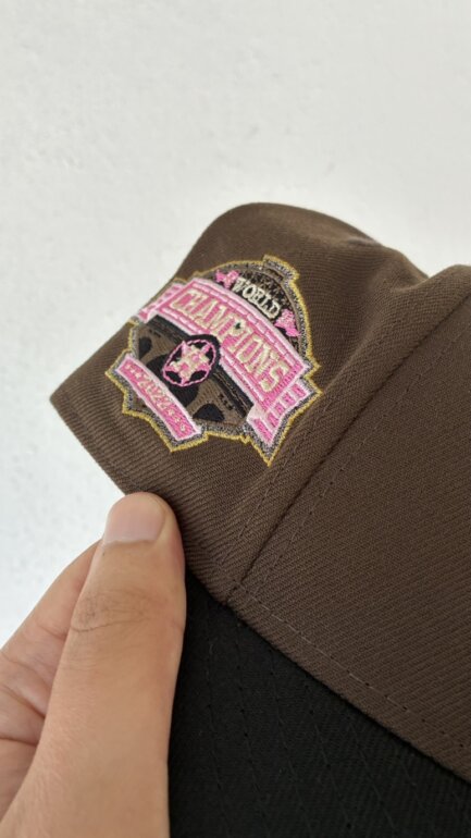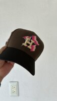 Color café con visera negra y bordado frontal multicolor.