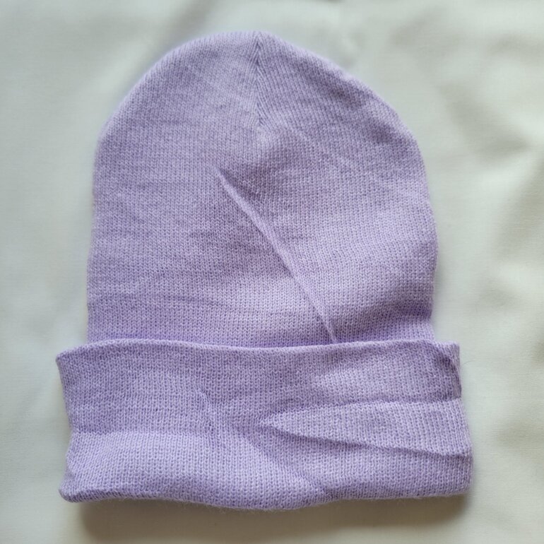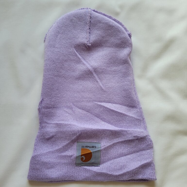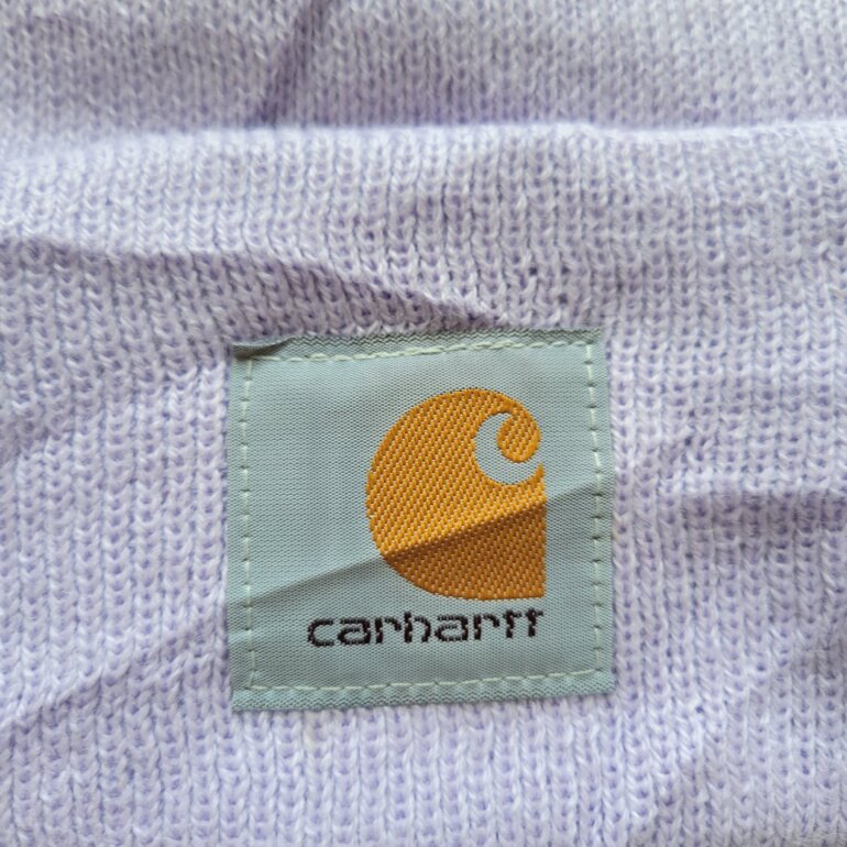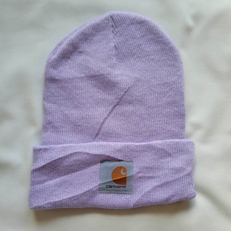 Gorro carhartt de acrilico en color lavanda suave o lila, logo a contraste, minimo uso.