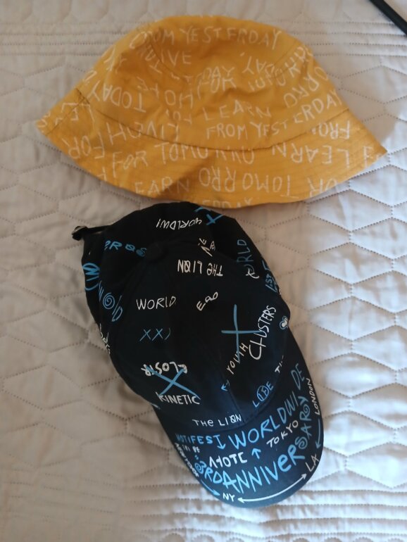 Gorros para niños de 3 a 5 años. El negro con turquesa es de Shein y tipo vicera y el amarillo es tipo Gilligan.