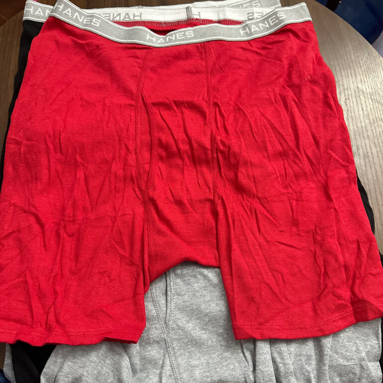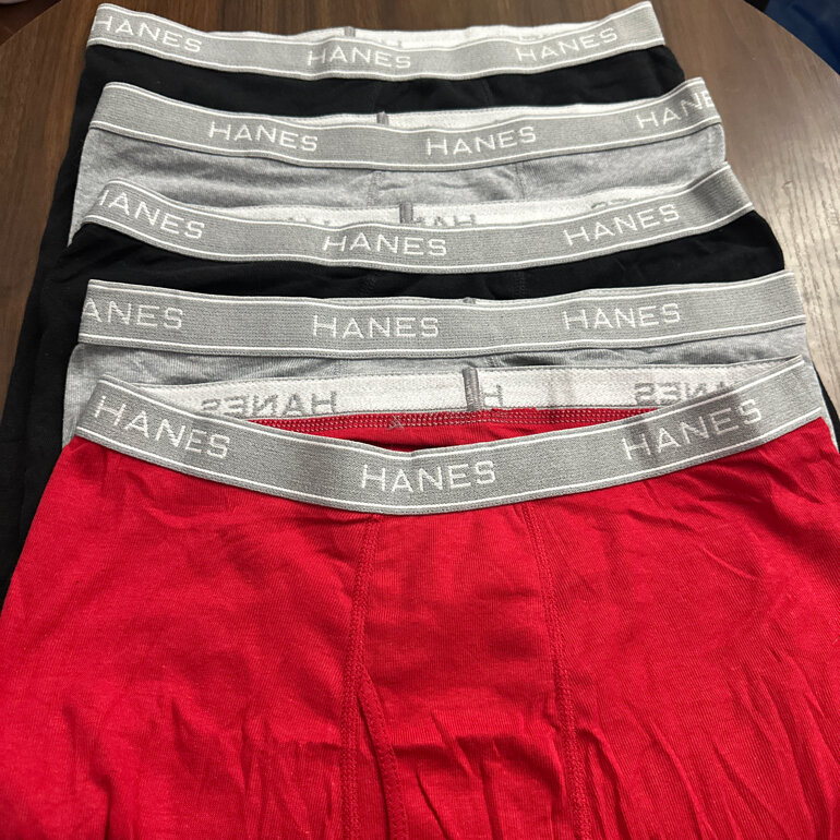 Set de 6 boxer marca Hanes . Talla grande de hombre. 2 de color negro , 2 de color gris y 1 de color rojo .