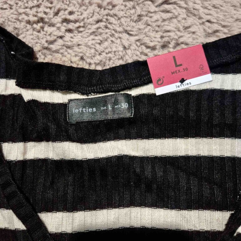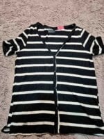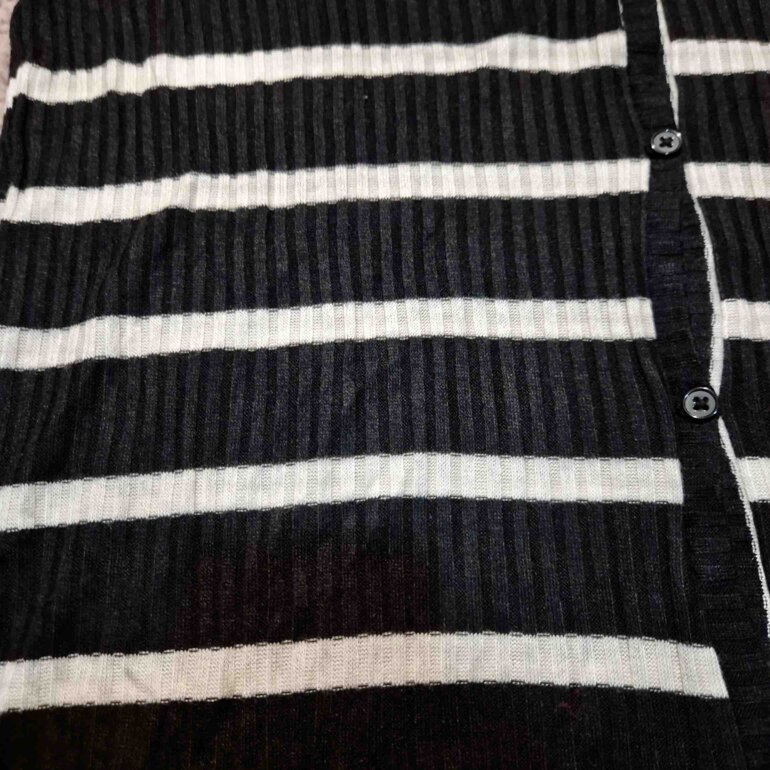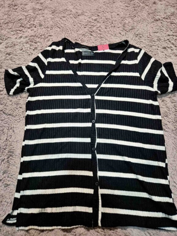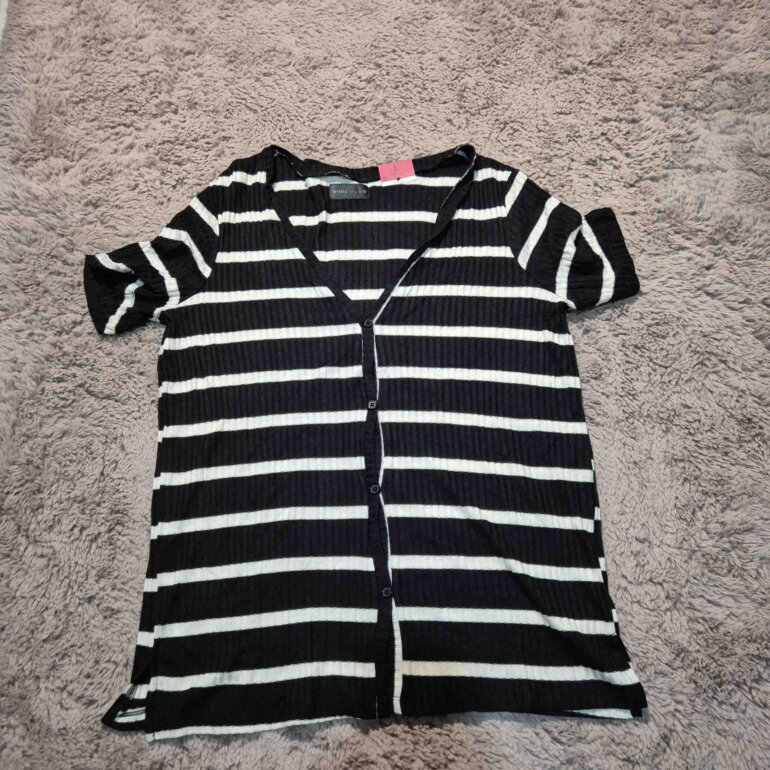 Hermosa blusa tejida negra con rayas blancas, mangas cortas y botones. Súper linda y ligera. Sin detalles.