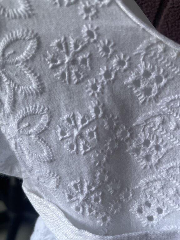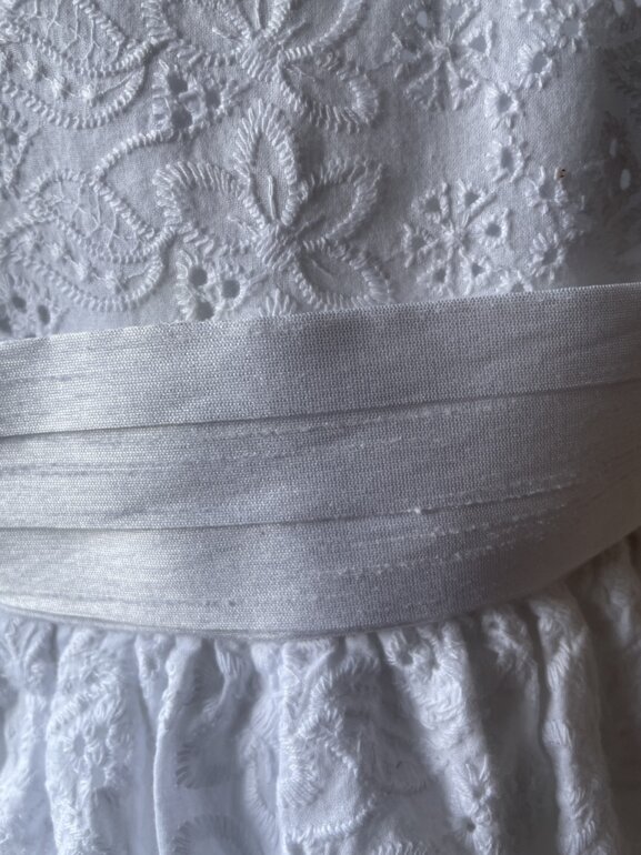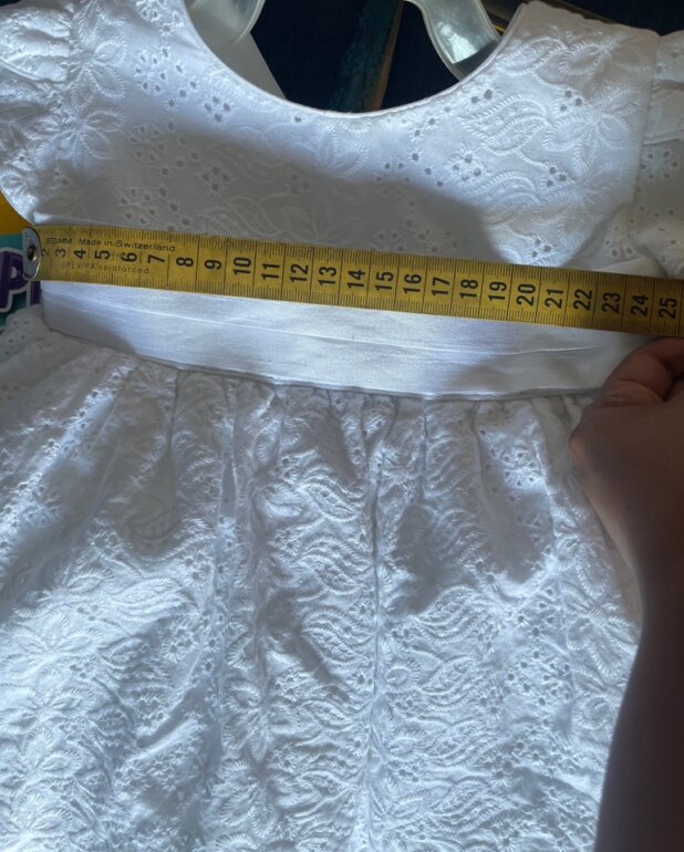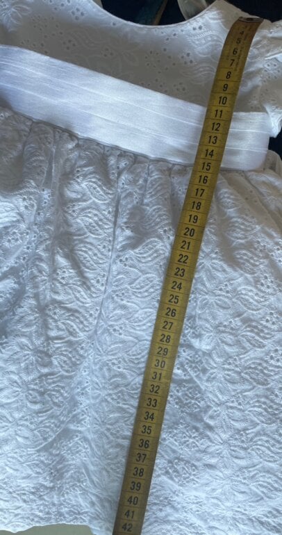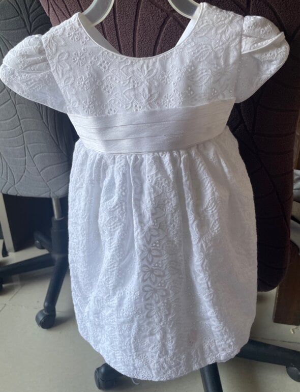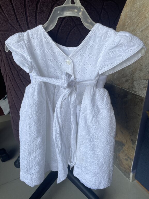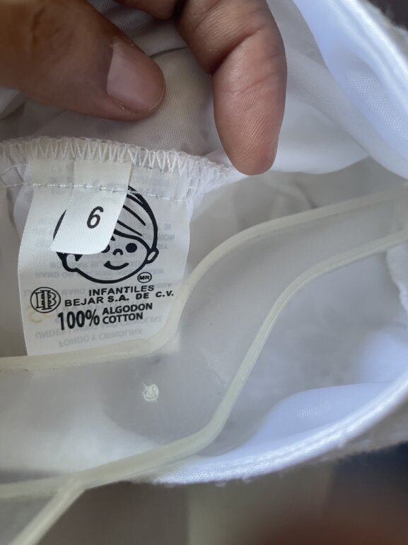 Bello vestido de bautizo para bebé La talla dice 6 meses pero mi bebé lo usó de 12 meses. Y lo pudo volver a usar en 2 ocasiones más como vestidito de fiesta.