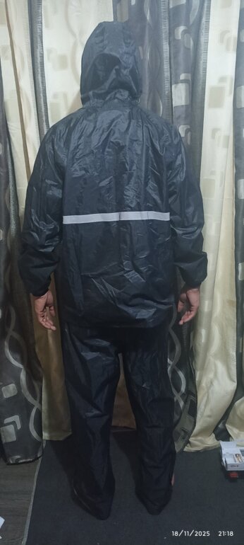 Impermeable completo, pantalón y chamarra, tiene cinta reflejante. Color negro.