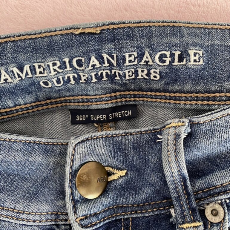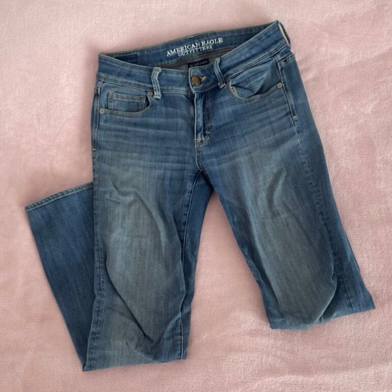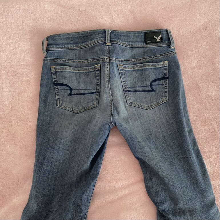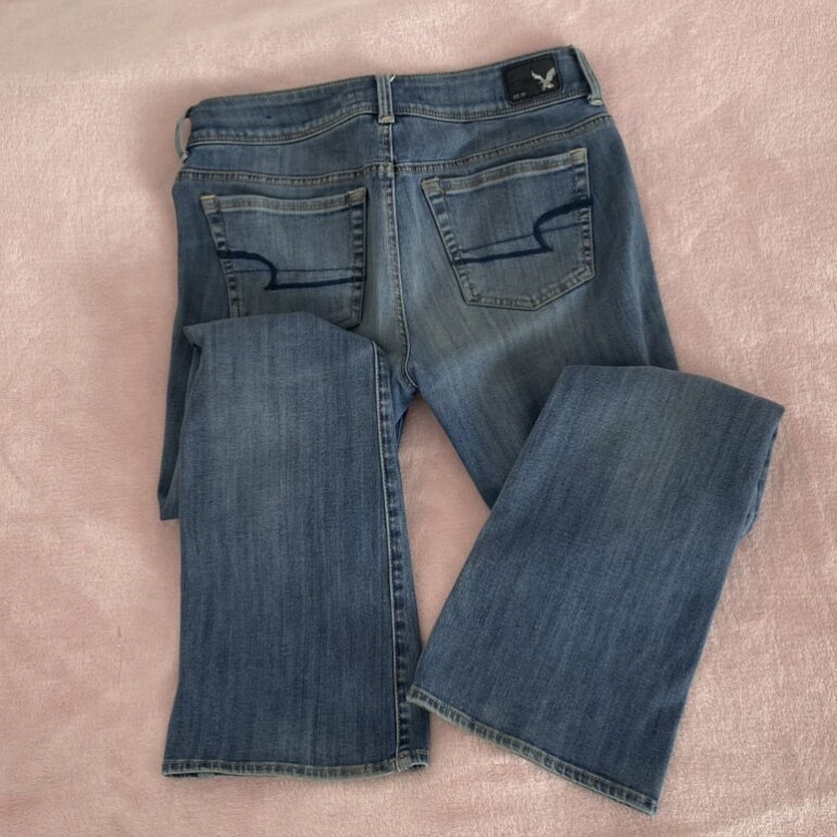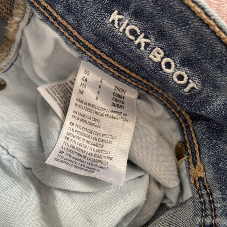 Jeans estilo flare kickboot con estilo deslavado vintage, trae como arrugado de las rodillas pero así es. Son súper stretch y tiro bajo con piernas acampanadas. American Eagle talla 4 Short. Sin detalles.