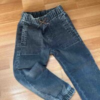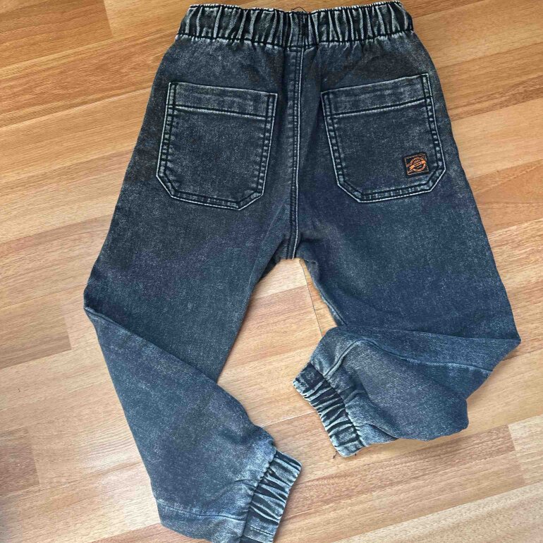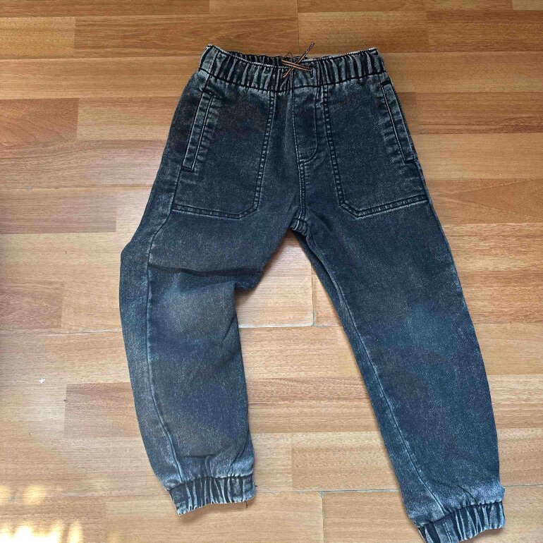 Jogger de mezclilla con resorte en cintura y tobillos tiene un poco de estréch la mezclilla color negro deslavado así es el modelo en perfecto estado