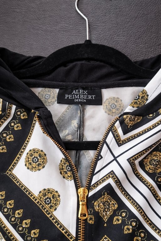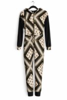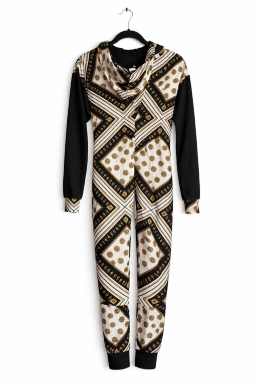 Jumpsuit estampado en negro, blanco y dorado con cierre frontal y capucha. Diseño llamativo y elegante, ideal para evento o look fashion. Excelente estado