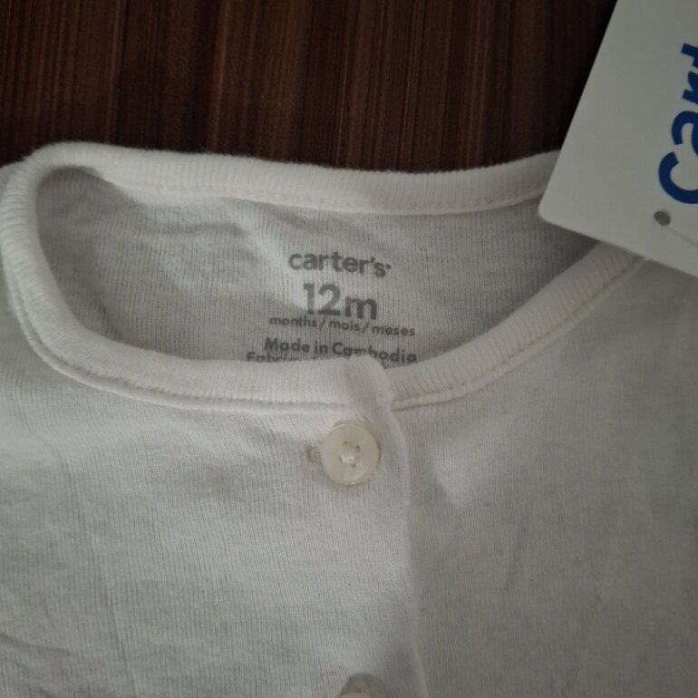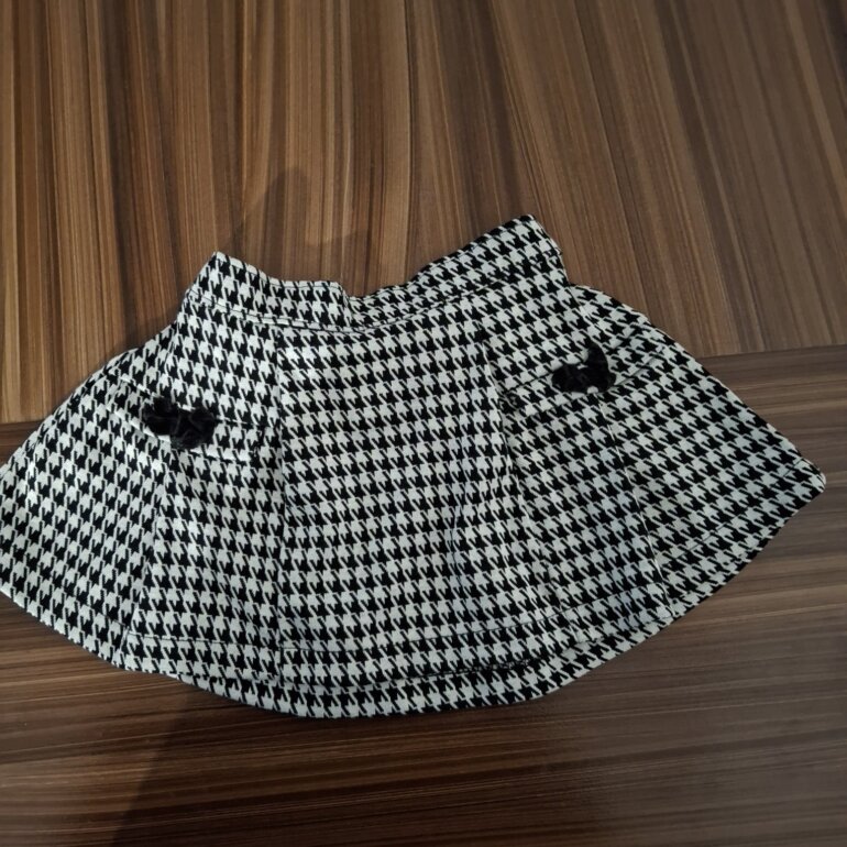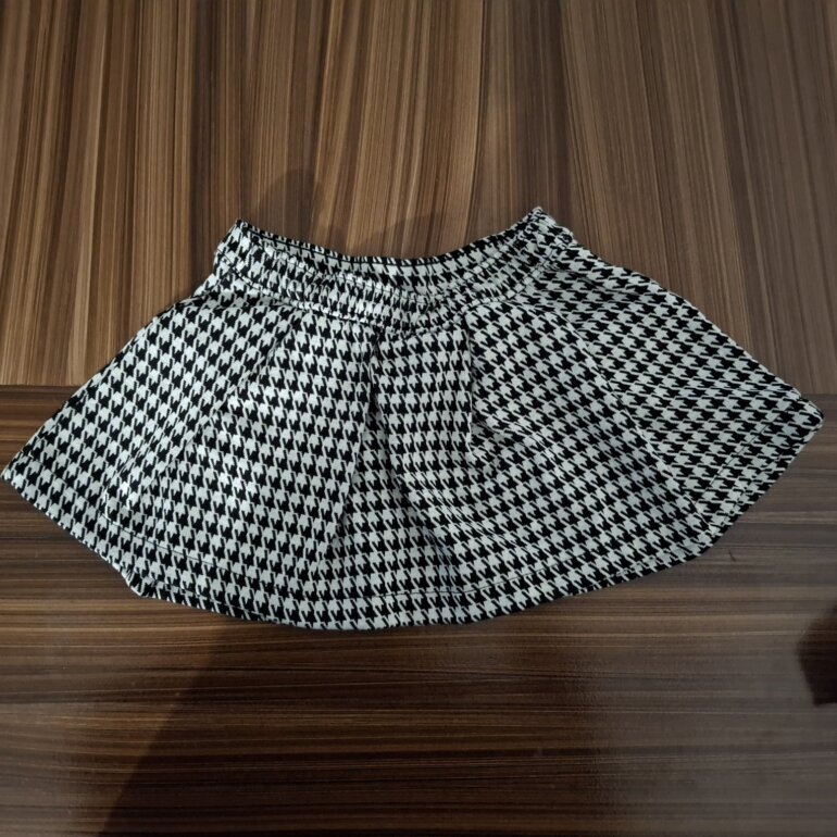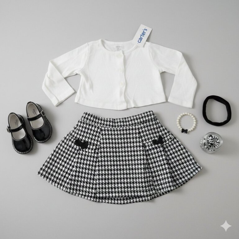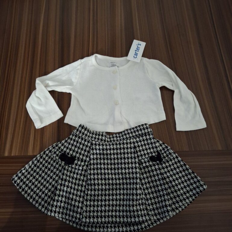 Conjunto armado, de Camisa de manga larga marca Carters en color blanco y falda banca con negro marca Nicole Miller.