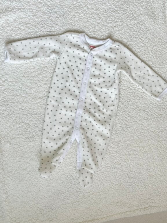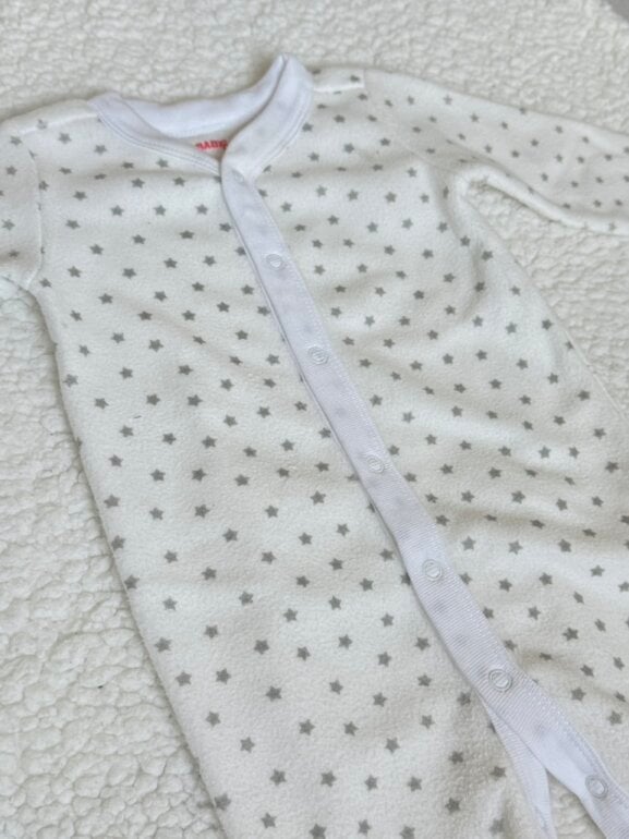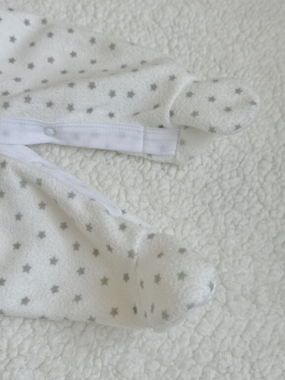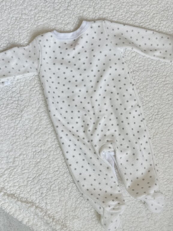 Hermoso mameluco tela polar, calientito y excelente calidad de la tela, sin detalles . Color blanco con estrellas. Cierre con botones