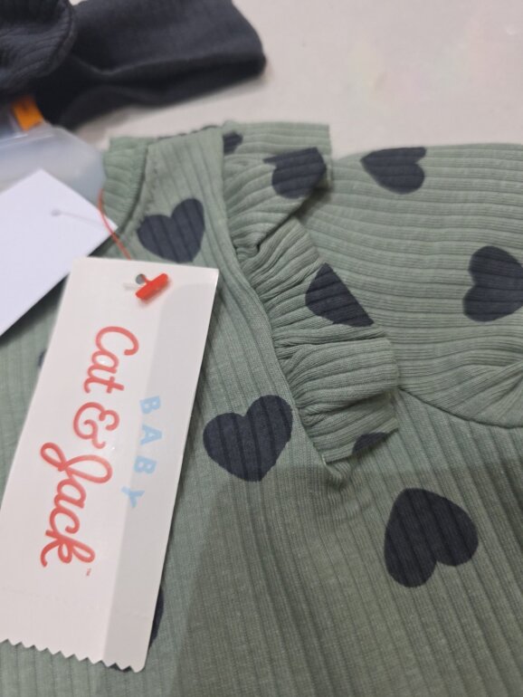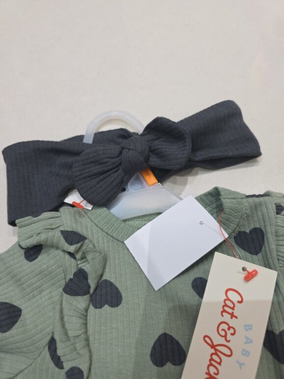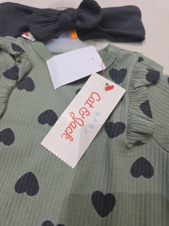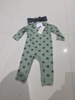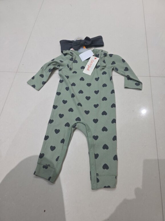 Hermoso mameluco, estampado de corazones en color verde pistache y corazones grises oscuro, incluye tiara gris oscuro, tela fresca y comoda.