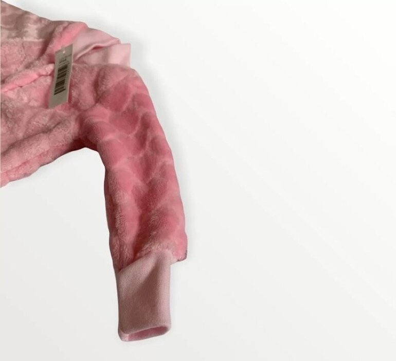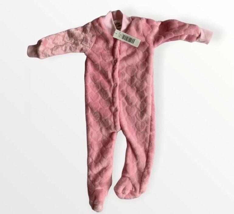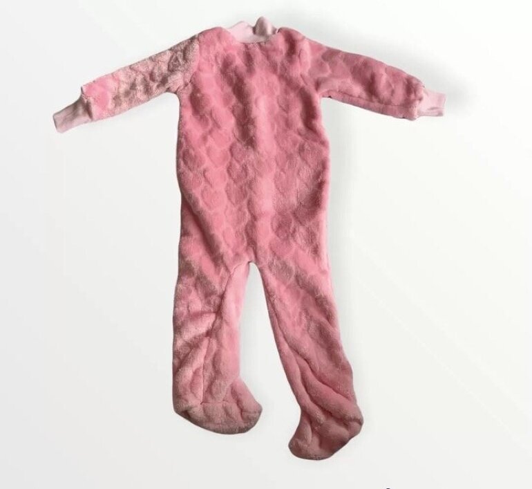 Es una prenda completa, con un ajuste de botones de presión desde el cuello hasta la ingle. Es de color rosa con print de corazones, mangas largas.
