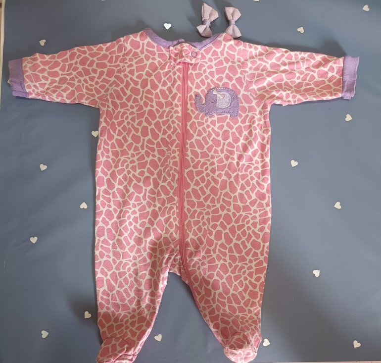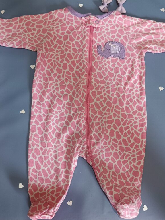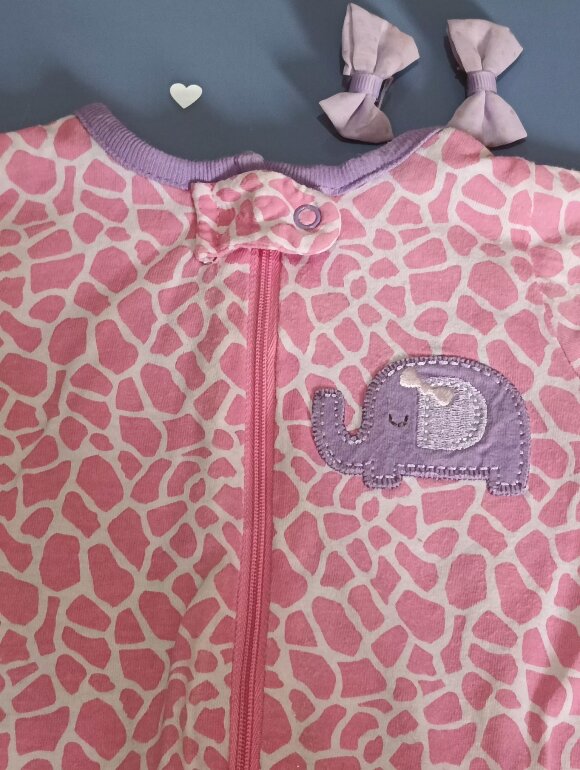 Mameluco rosa elefante con vivos morados en cuello y mangas que por cierto son largas bordado un elefante en parte del pecho cierre largo.