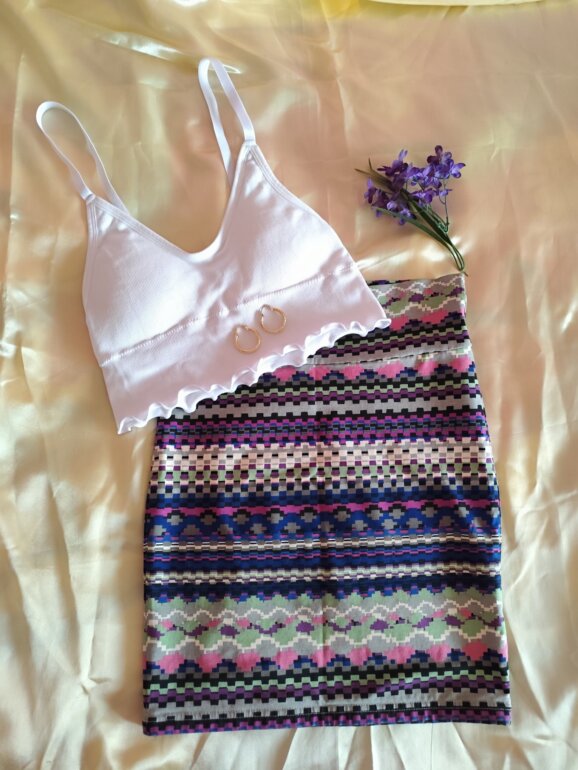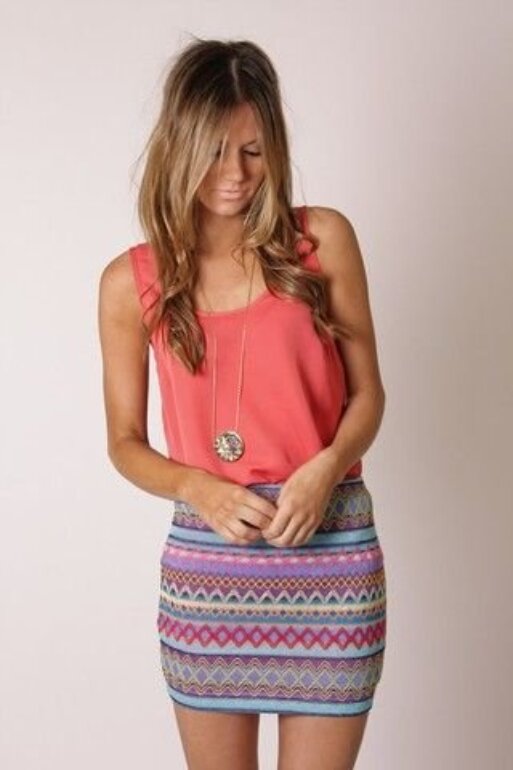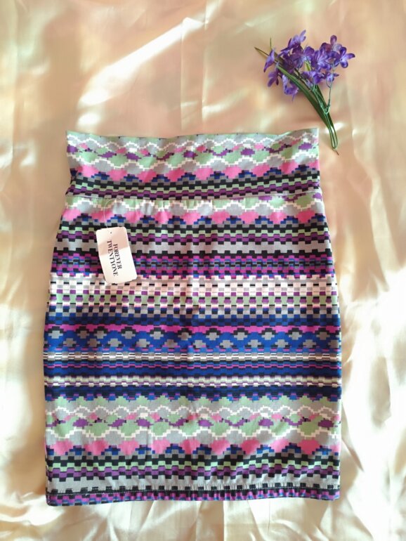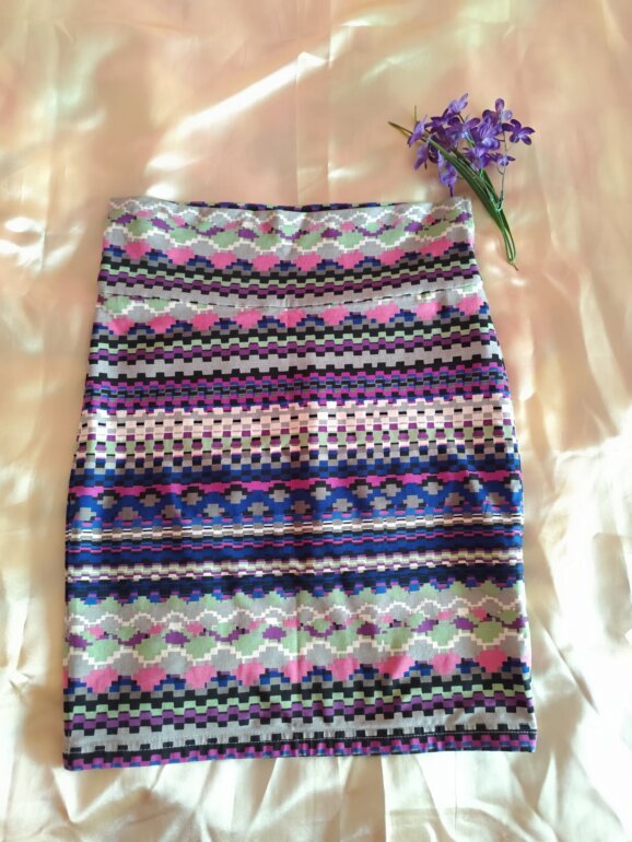 Bonita mini falda estilo tribal, son grecas en colores súper bonitos, es recta y mide 34 cm sin estirar y 40 cm estirando, de cadera 38 cm y de largo 45 cm.