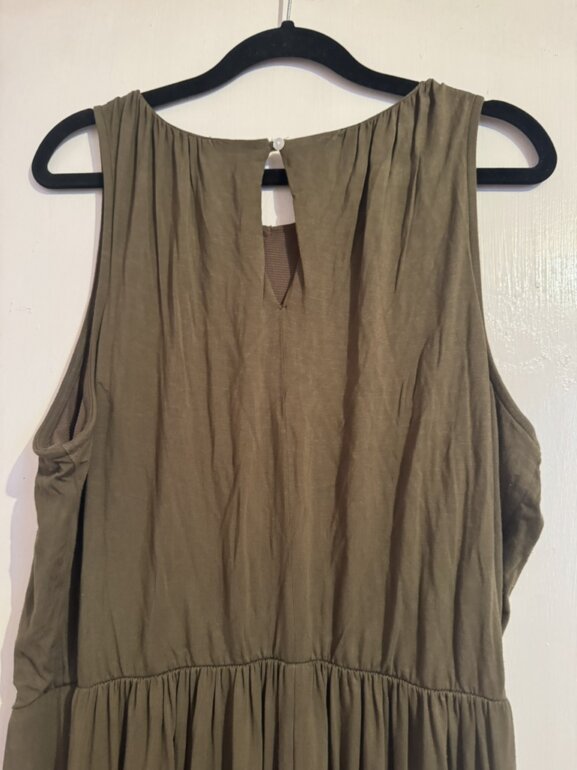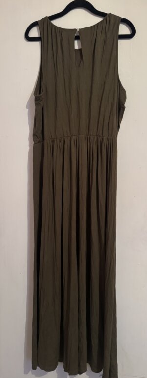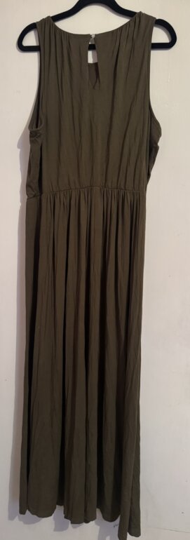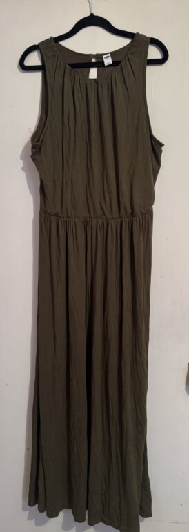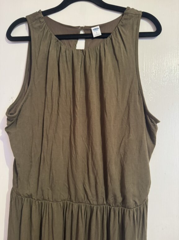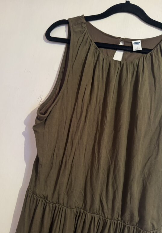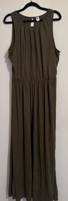 Moderno vestido Old Navy talla LG en color verde olivo sus medidas de axila a axila es 59cm de largo mide 123cm cintura trae resorte y se expande bastante estela que estira sin detalles en perfecto estado muy bonito