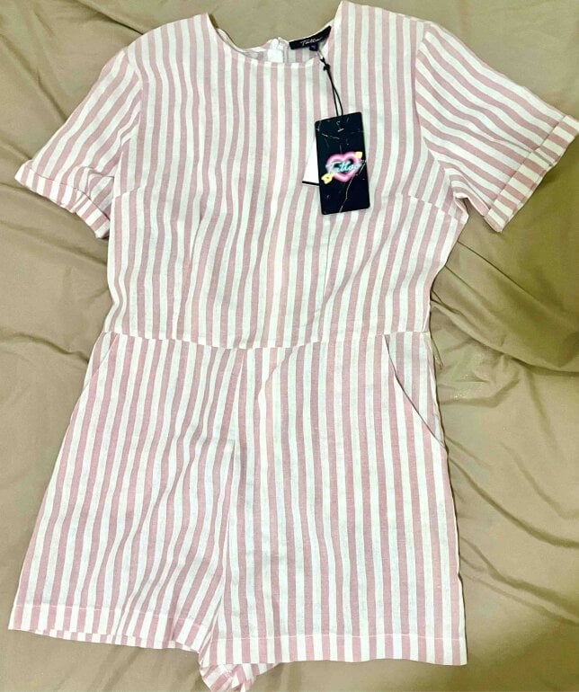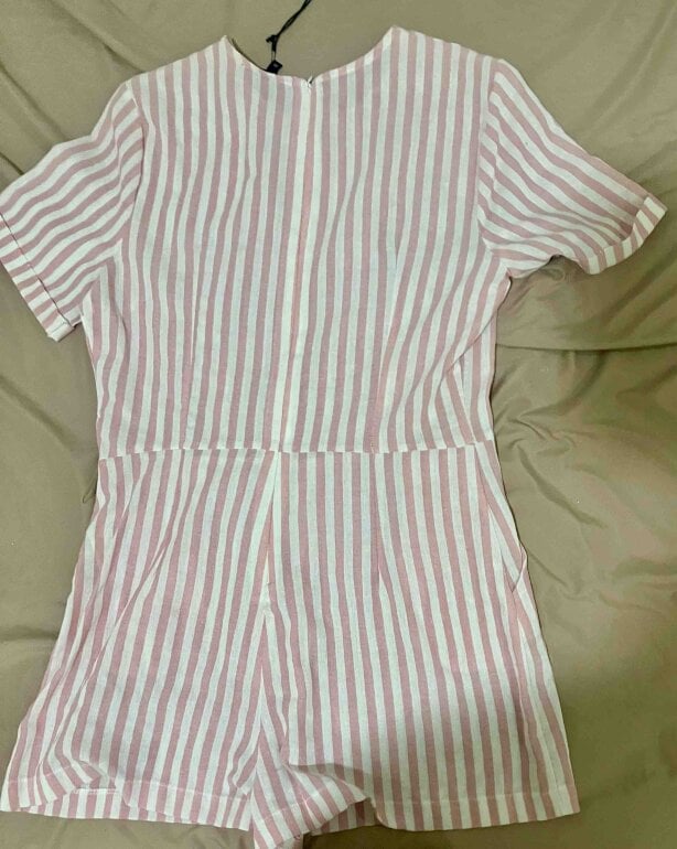 Mono de manga corta casual, color rosa con estampado de rayas blancas, perfecto estado con etiqueta, ancho 40 cm largo 78 cm