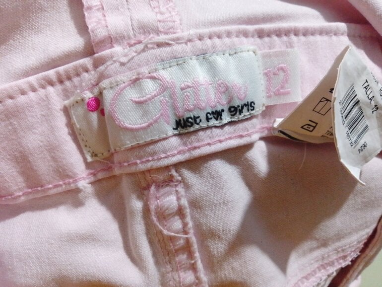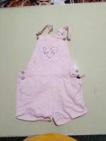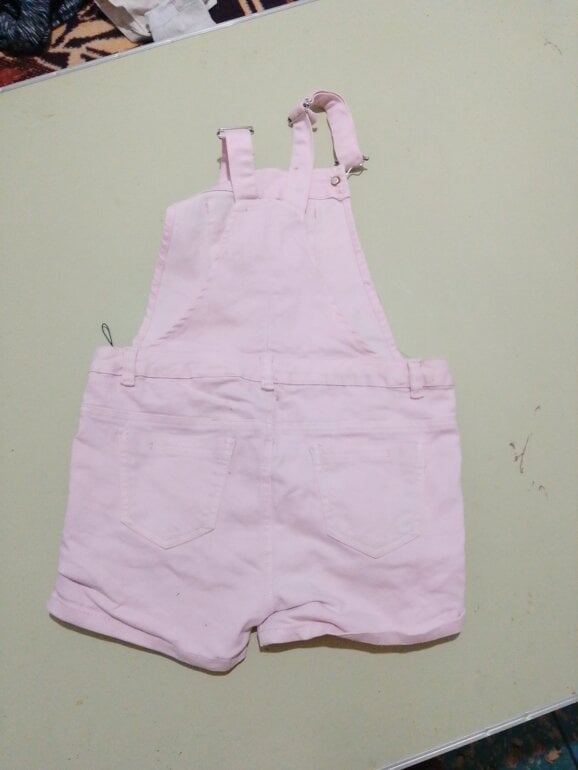 Es un oberol de mezclilla rosa, se le borró la parte del texto que decía "Barbie" pero el material sigue siendo resistente