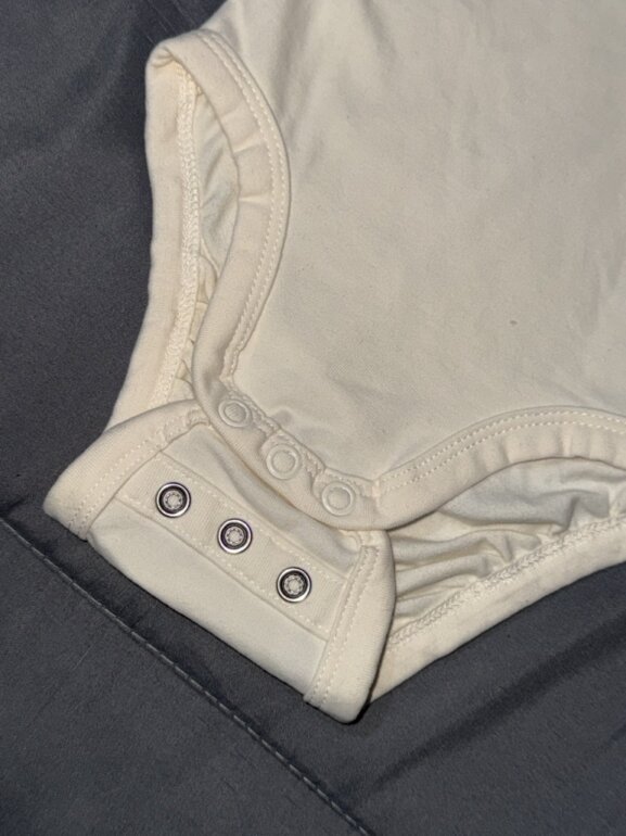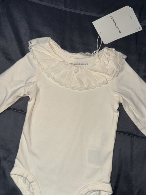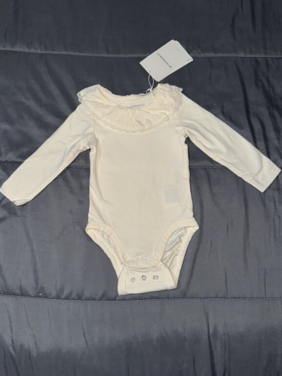 Overol de bebé talla 3 Meses, tiene olanes en el cuello y la tela es suavecita, es color beige nuevo con etiquetas