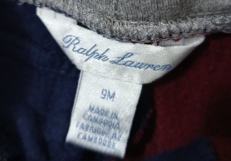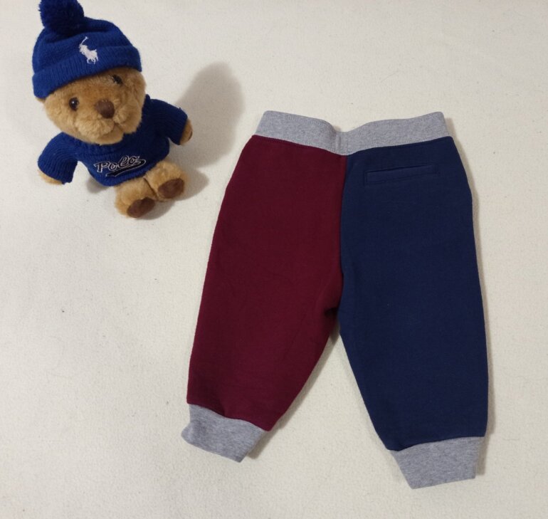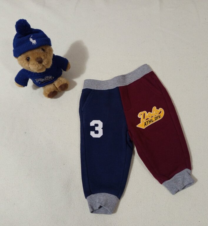 Hermoso pants Ralph Lauren, color guinda y azul, súper moderno, cómodo, calientito, parches decorativos de la marca, talla ,9 meses