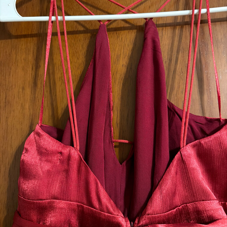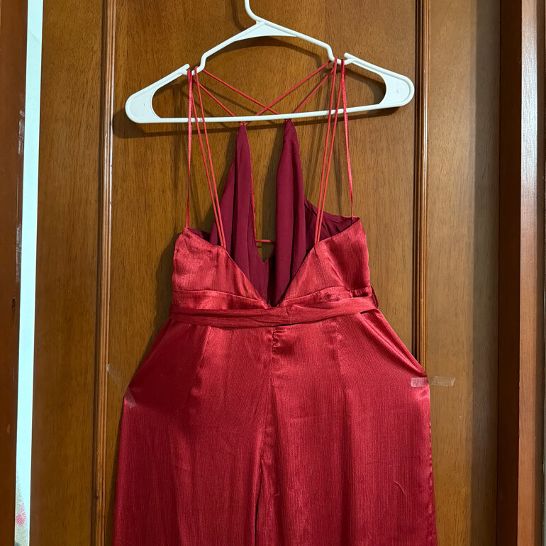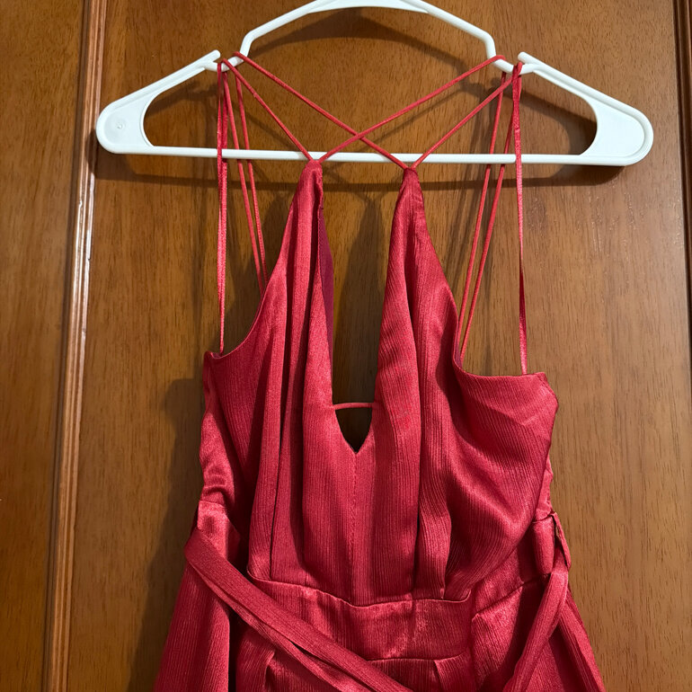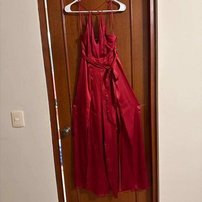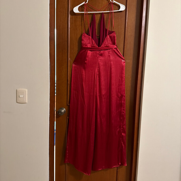 Palazzo rojo brillante con tela suave , con tiras cruzadas en la espalda , las botas del pantalón abiertas ., largo desde los hombros 106cms, contorno de busto 80 cms , contorno de busto 75cms , contorno de cadera 100cms