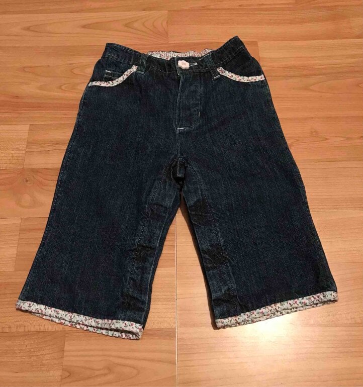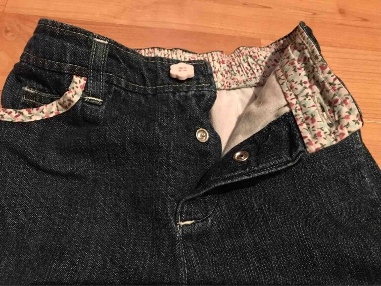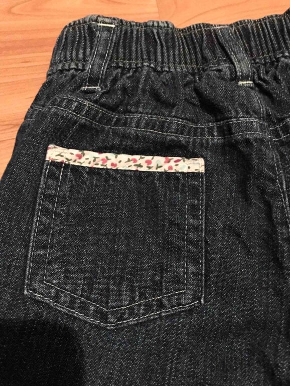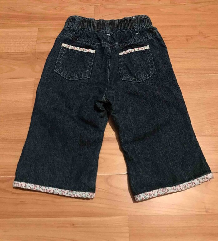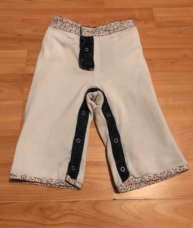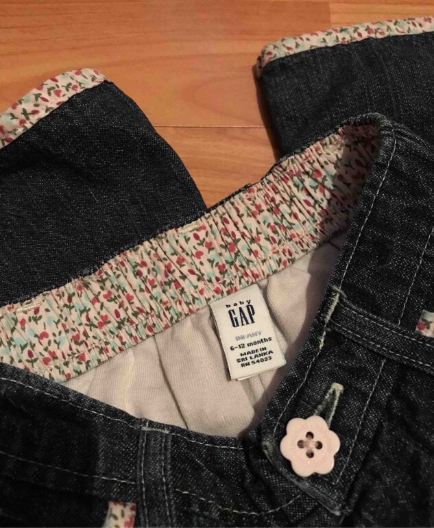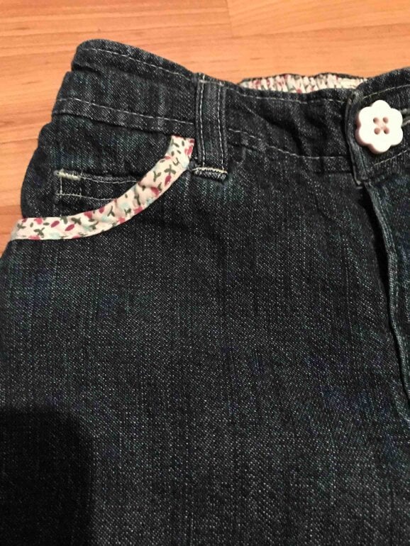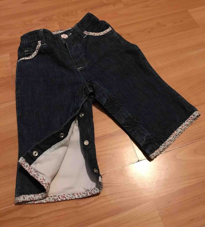 Tierno y lindo con broches de presión en entrepierna, totalmente forrado con tela suave al tacto, cuenta con 5 bolsillos( 1mini al frente abrocha con broche de presión y un botón de flor.