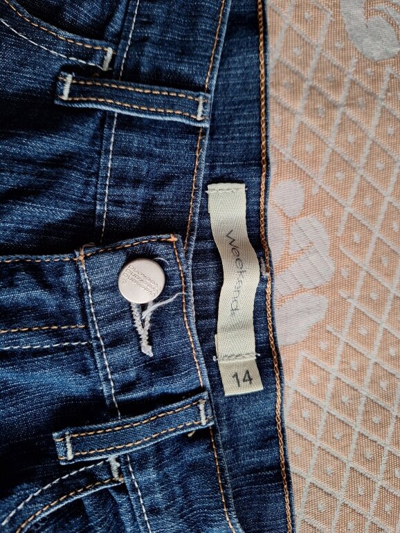 Pantalón azul de mezclilla marca Weekend talla 14, es grueso y con botones en la parte trasera, 2 bolsillos delanteros y 2 bolsillos traseros.