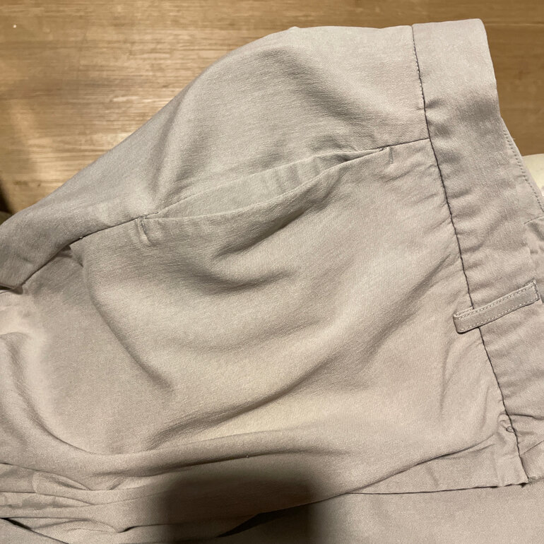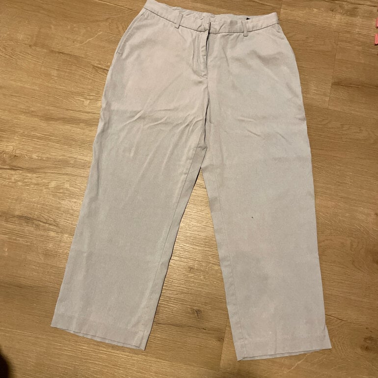 Pantalón gris de vestir capri con bolsas al frente y detalle de botón en la parte trasera