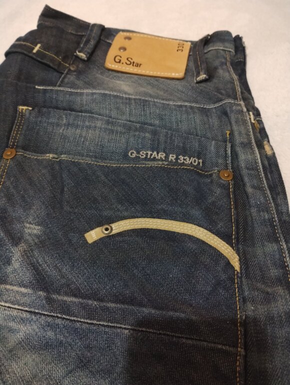 - Detalles industriales: Costuras reforzadas, cremalleras expuestas, bolsillos con diseño funcional y etiquetas de cuero con el logo “G-Star RAW”.