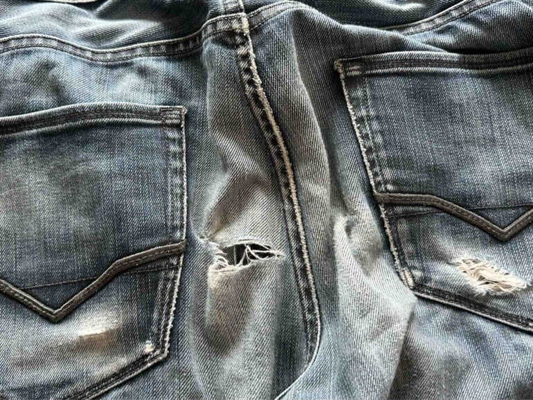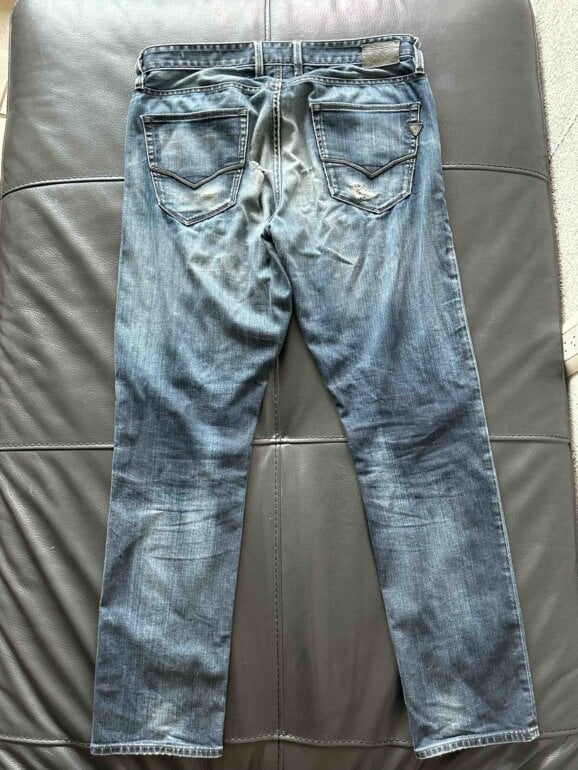 El pantalón tiene un ligero detalle en la parte trasera, una pequeña abertura que se puede reparar fácilmente con un parche o costura.