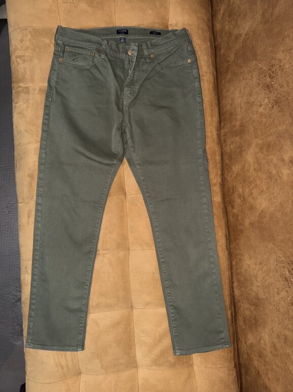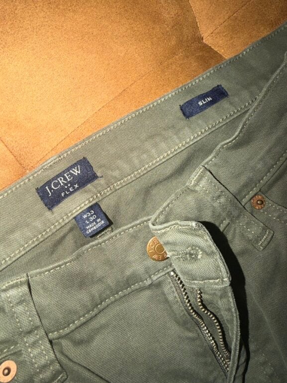 Pantalón J Crew Flex, slim talla W33 L30, color verde militar