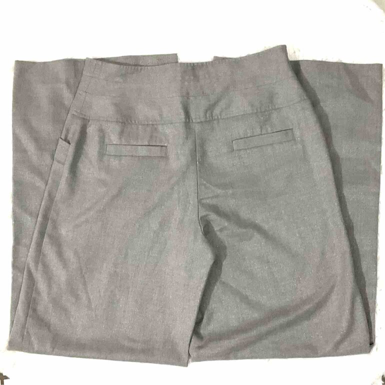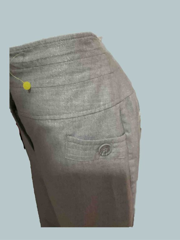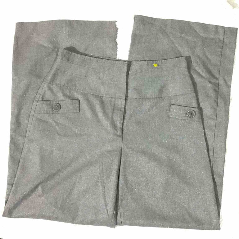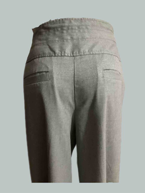 Pantalón de pierna ancha tipo palazzo en tela gris con destellos con poco strech, bolsillos traseros, cintura alta.