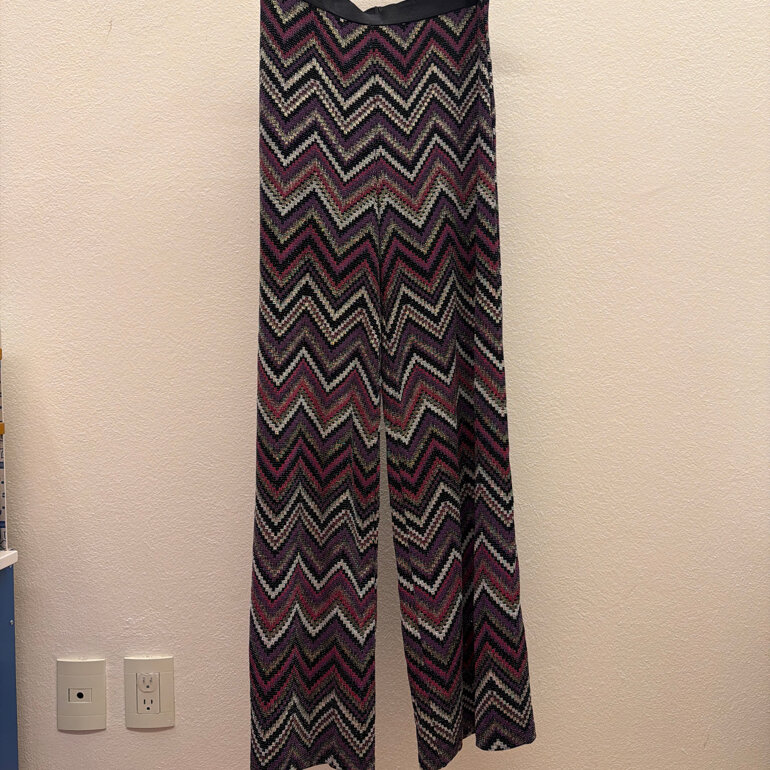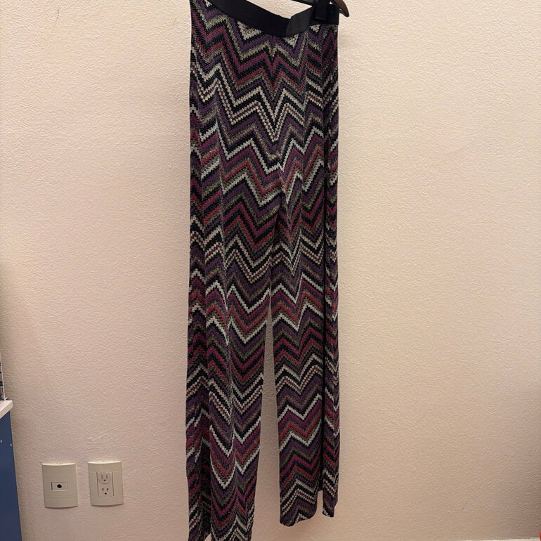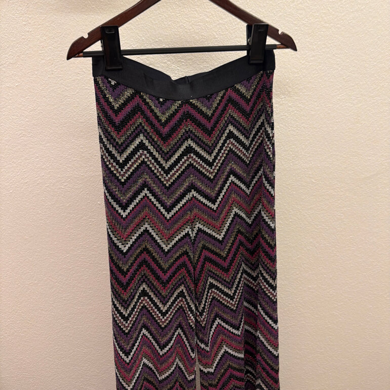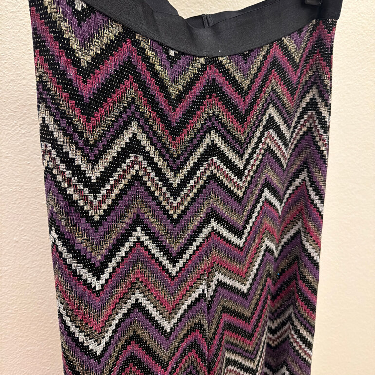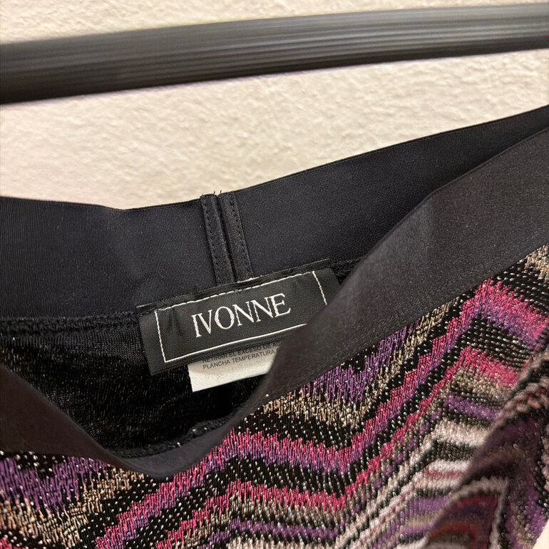 Pantalón tejido de punto, con motivo de zigzag violeta, rosa, plateado. Tela elástica. Marca Ivonne, talla G