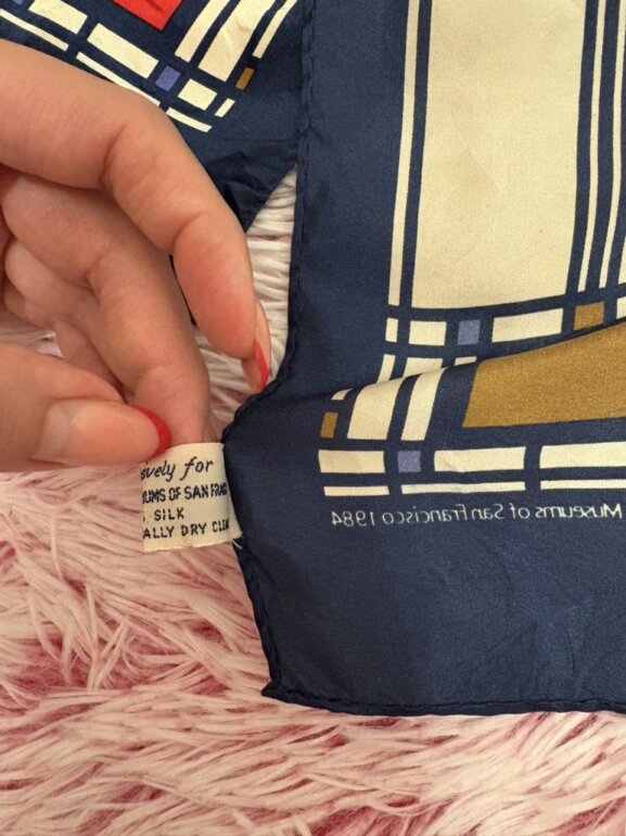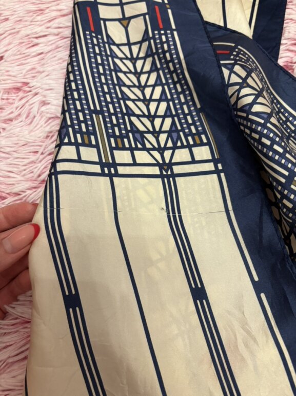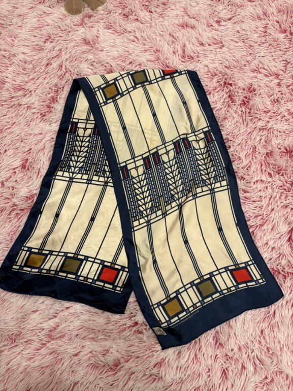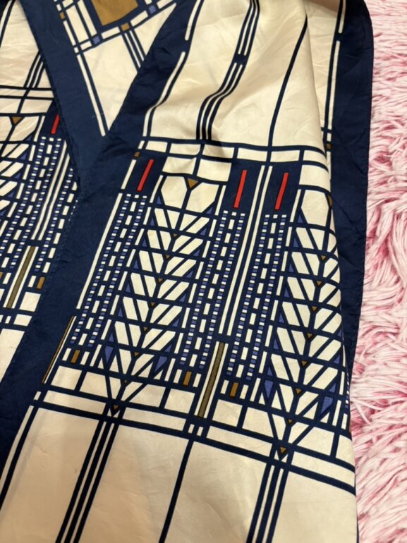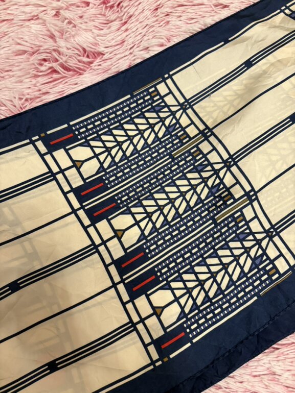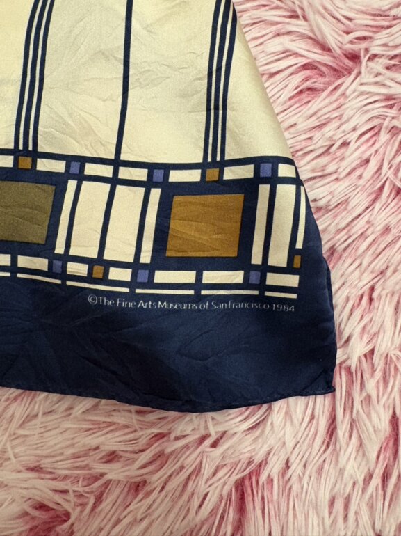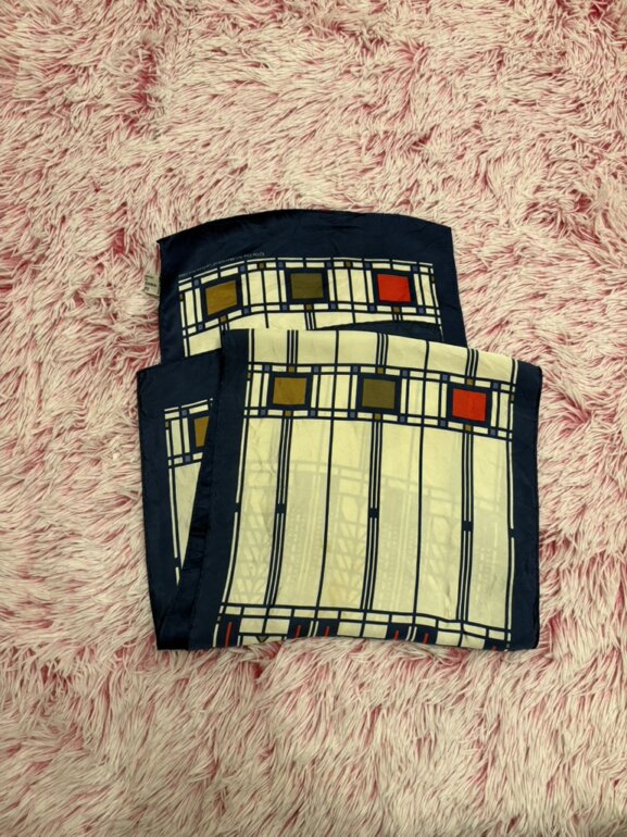 Pañuelo de seda con un diseño de vidriera de colores de Frank Lloyd Wright. El diseño específico se conoce como el motivo del "Árbol de la Vida" (Tree of Life) vendidas por museos, incluyendo el Museo de Arte Moderno (MoMA) de Nueva York y los Museos de Bellas Artes de San Francisco. Es un pañuelo vintage o de colección 😉 mini detallito de hilito jalado pero casi ni perceptible 👌🏻