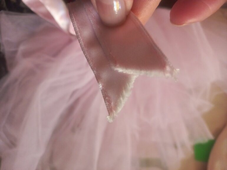 El otro rosa pastel, con cinta en la cintura de satín, la cual tiene un poco deshiladita la punta (se puede fácil reparar). Éste no tiene marca y queda aprox. Talla 4-6 años.