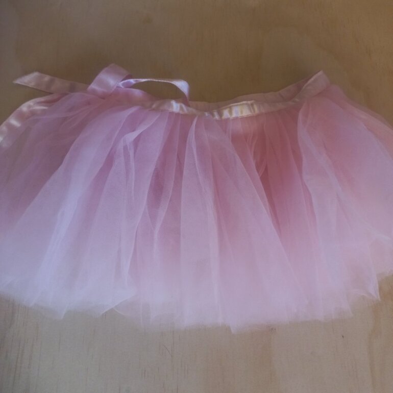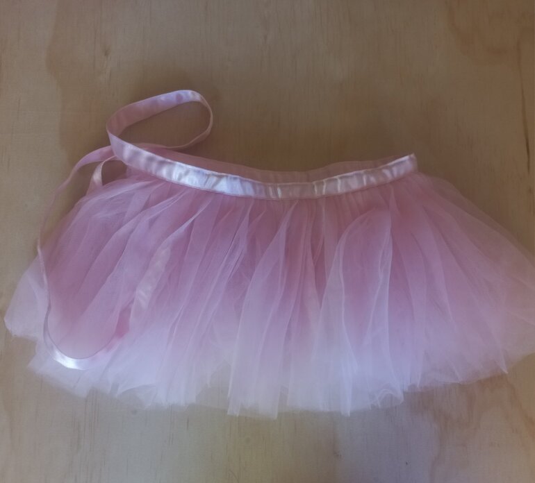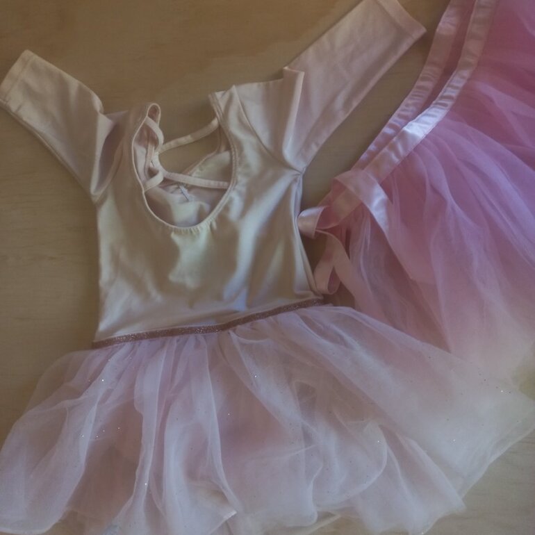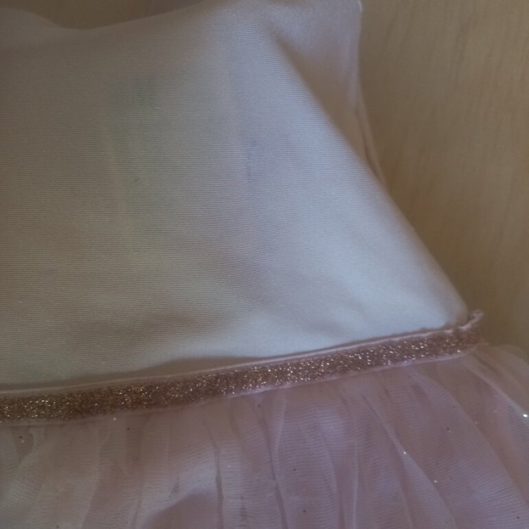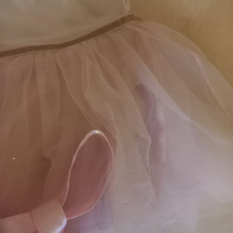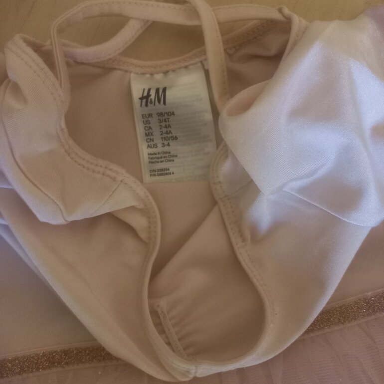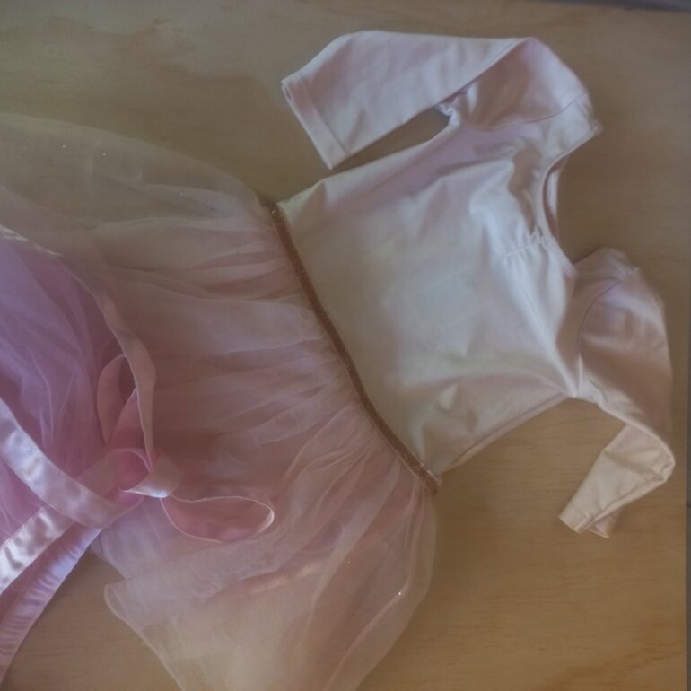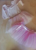 Uno con leotardo de licra, color rosa pálido con destellos dorados en el tul. Ligera marca de plumon casi imperceptible. MARCA H&M.