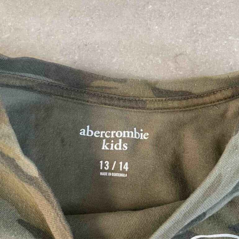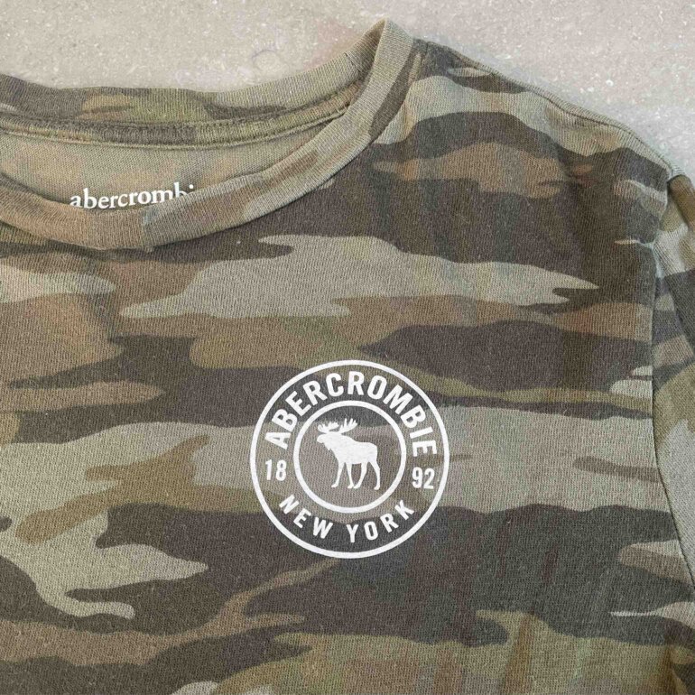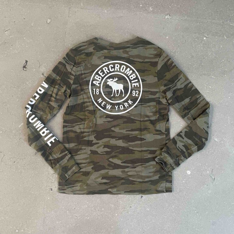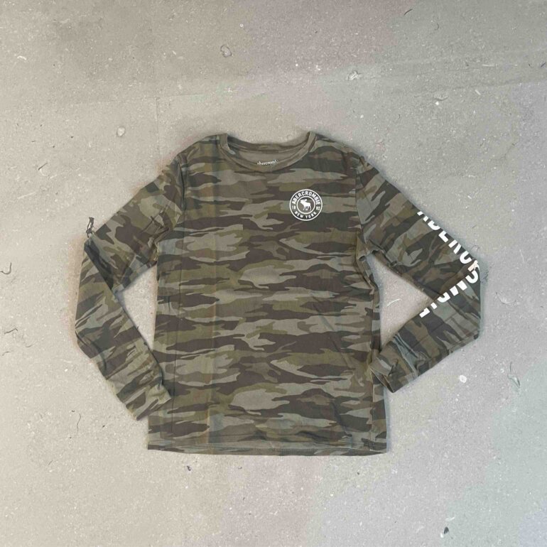 Playera de algodón Manga Larga, estampado militar, con letras de la marca en la manga, con logo de la marca pequeño en la parte de enfrente y grande en la parte posterior, talla 13-14 años de niño, Marca Abercrombie & Fitch, en Excelentes Condiciones sin Detalles.