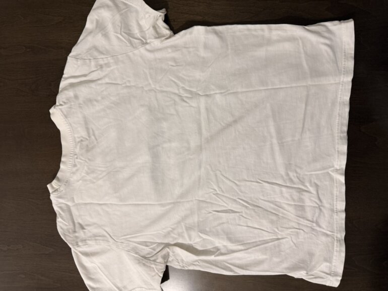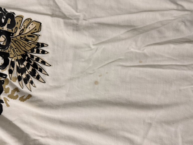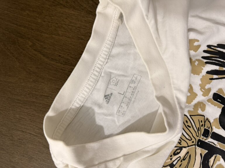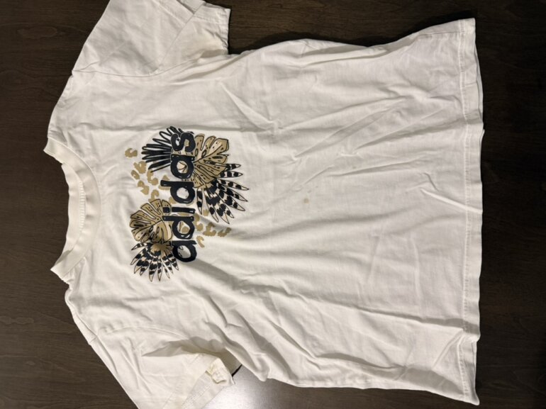 Playera blanca con estampado de marca Adidas y manga corta, talla grande en buenas condiciones bajo algunos detalles en cuello y axila, algunas manchas en el frente