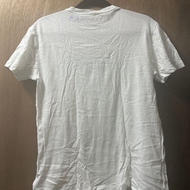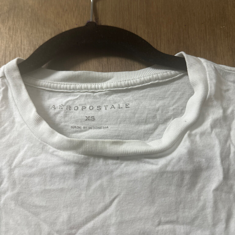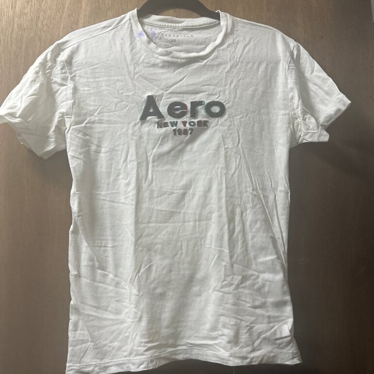 Playera Aeropostale, color blanco con letras azules, talla xs, detalle en el cuello