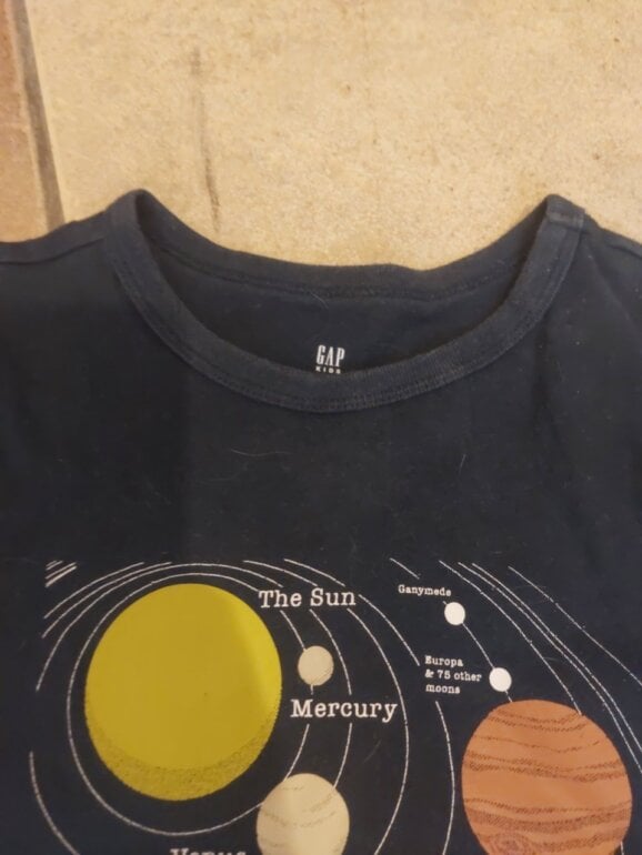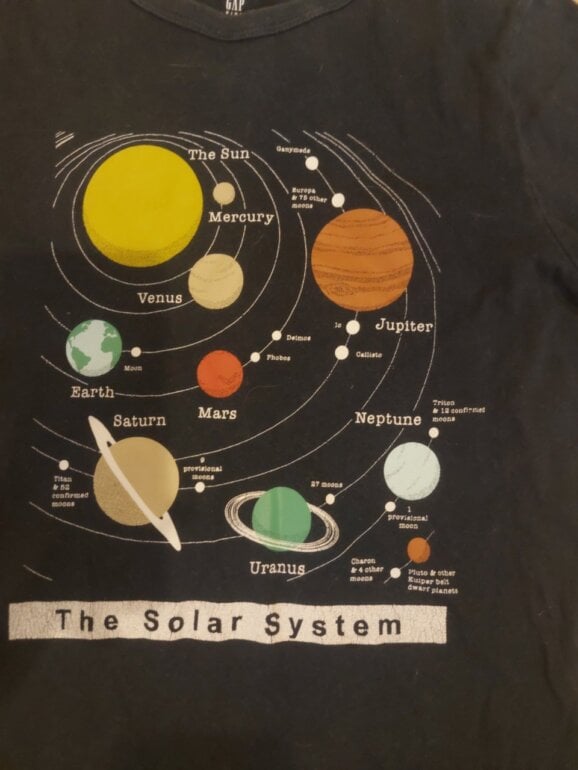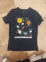 Playera manga corta, cuello redondo azul marino con el sistema solar en ingles