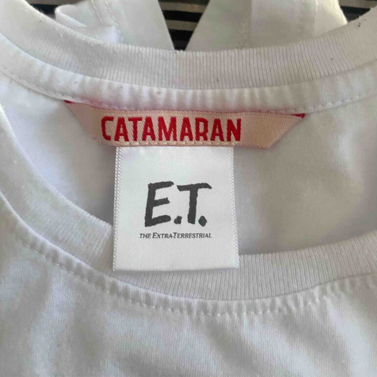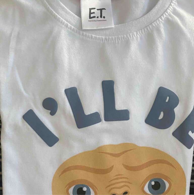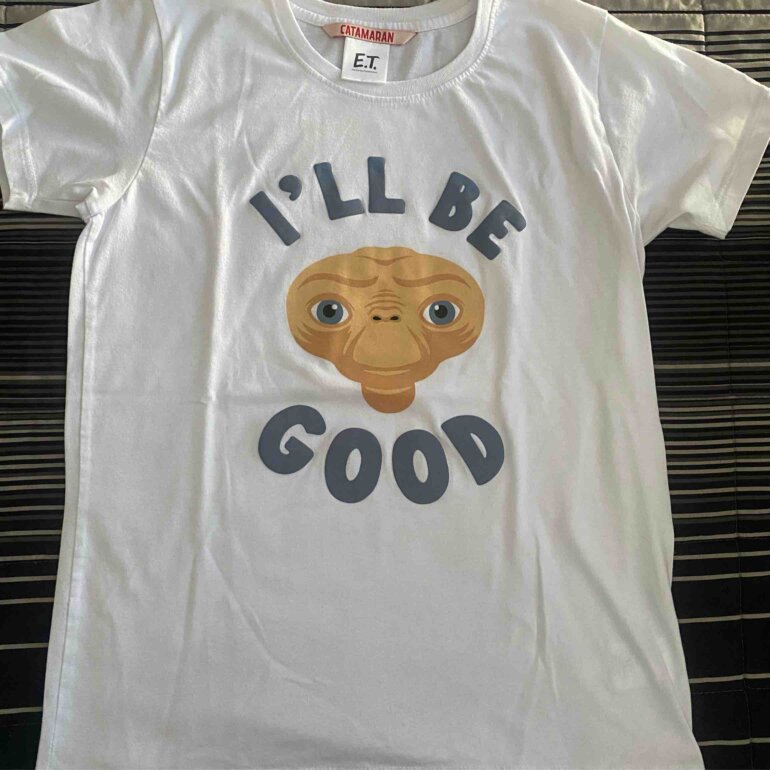 Playera blanca niño, manga corta, cuello redondo, con dibujo de E.T., talla 14 años, sin ningún defecto, puesto 1 vez