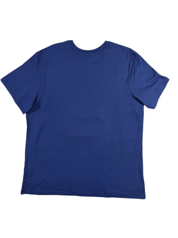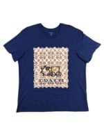 Playera de color azul marino con cuello redondo, estampado con estilo monocromático.