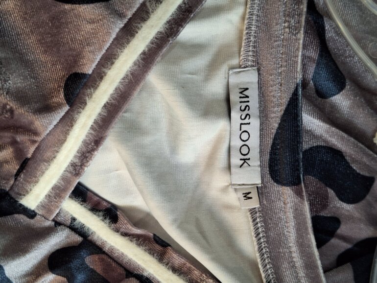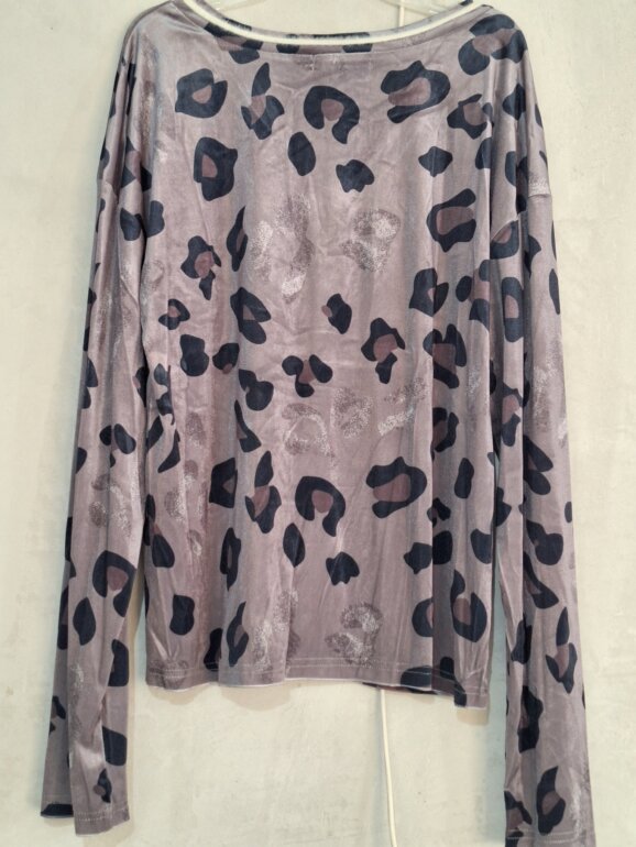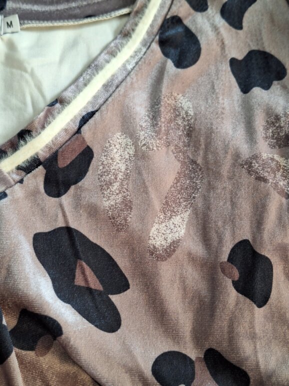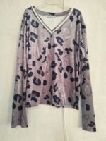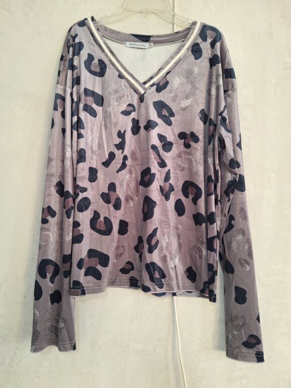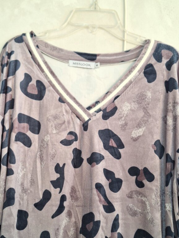 Playera de manga larga, cuello v, estampado de leopardo, tela de terciopelo, nueva marca misslook talla M, viene amplia da una L también. Mide 56cm de axila a axila.