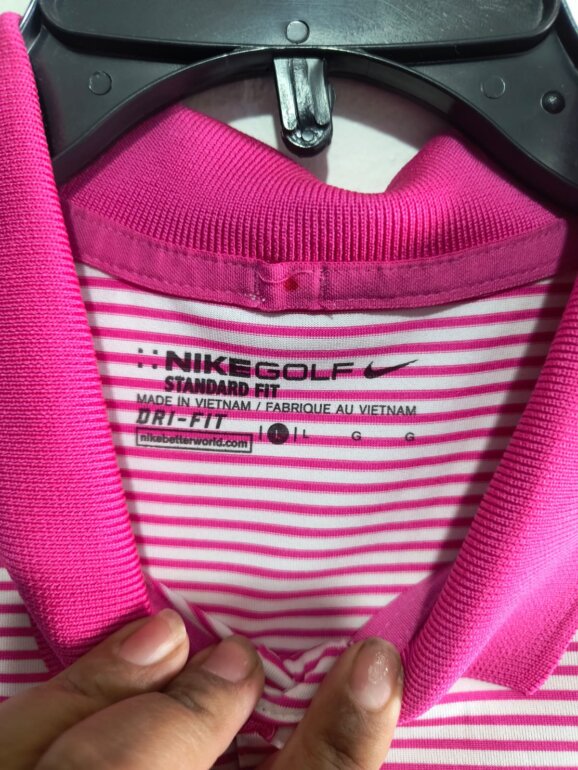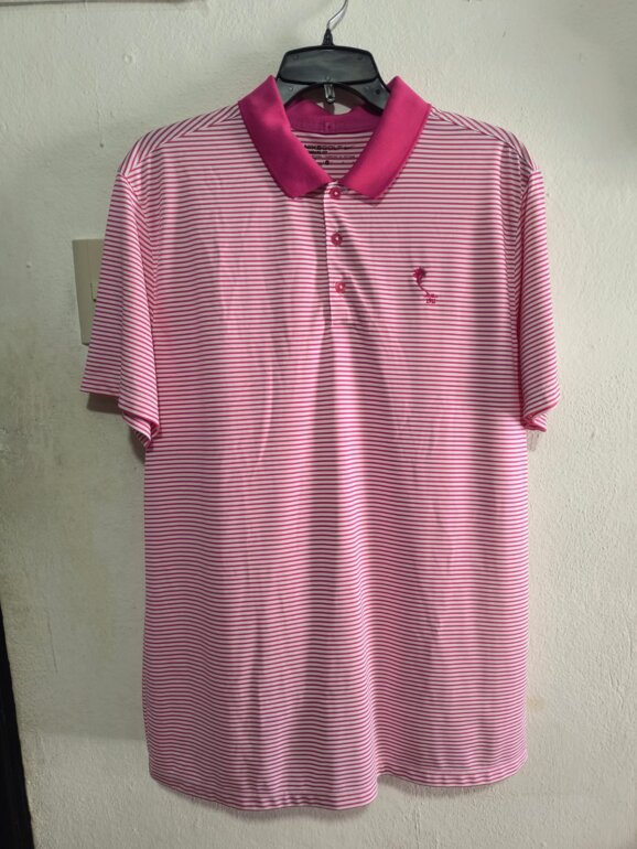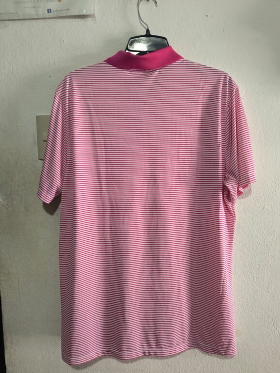 Playera tipo polo diseño de rayas, en color rosa y blanco
