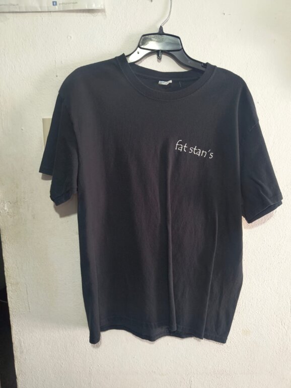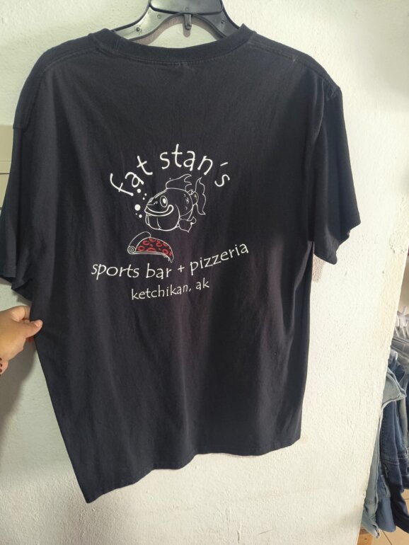 Playera de hombre con estampado en la parte de adelante del lado izquierdo y la parte de atrás en medio