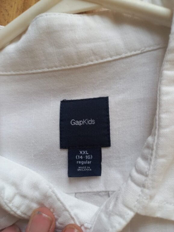 En perfecto estado cuello botones es talla 14-16 la tela es como de lino muy bonita y si te gusta algo mas de mi closet lo tengo todo en remate acepto oferta y en paquetes buen descuento